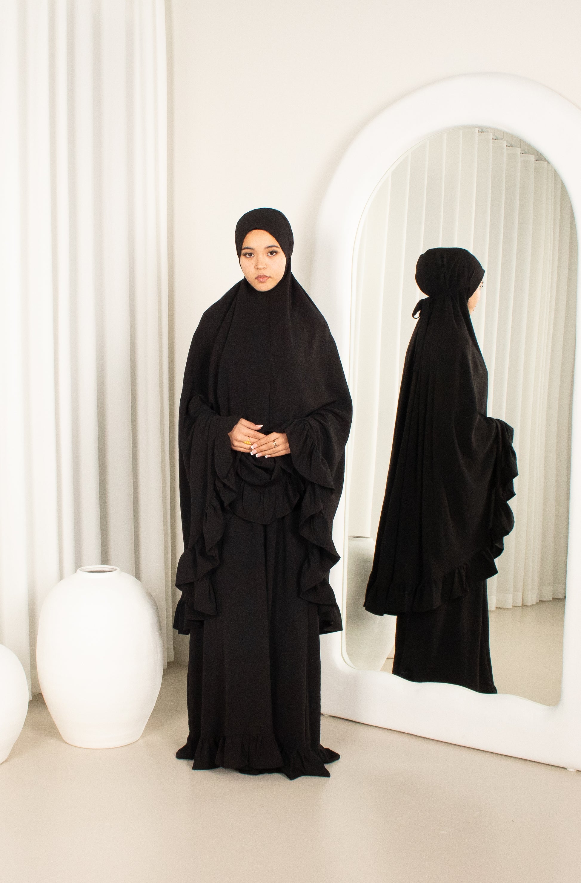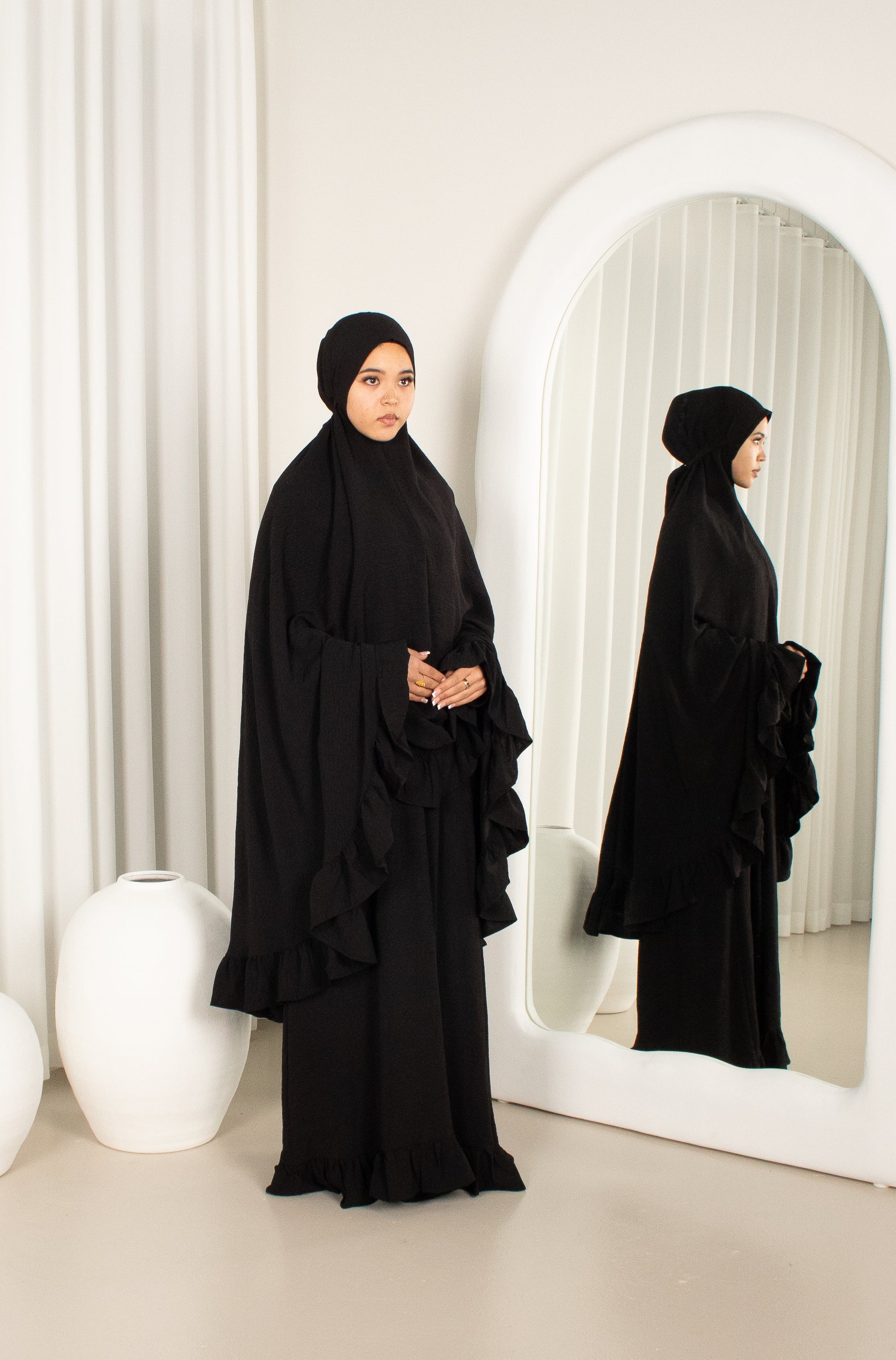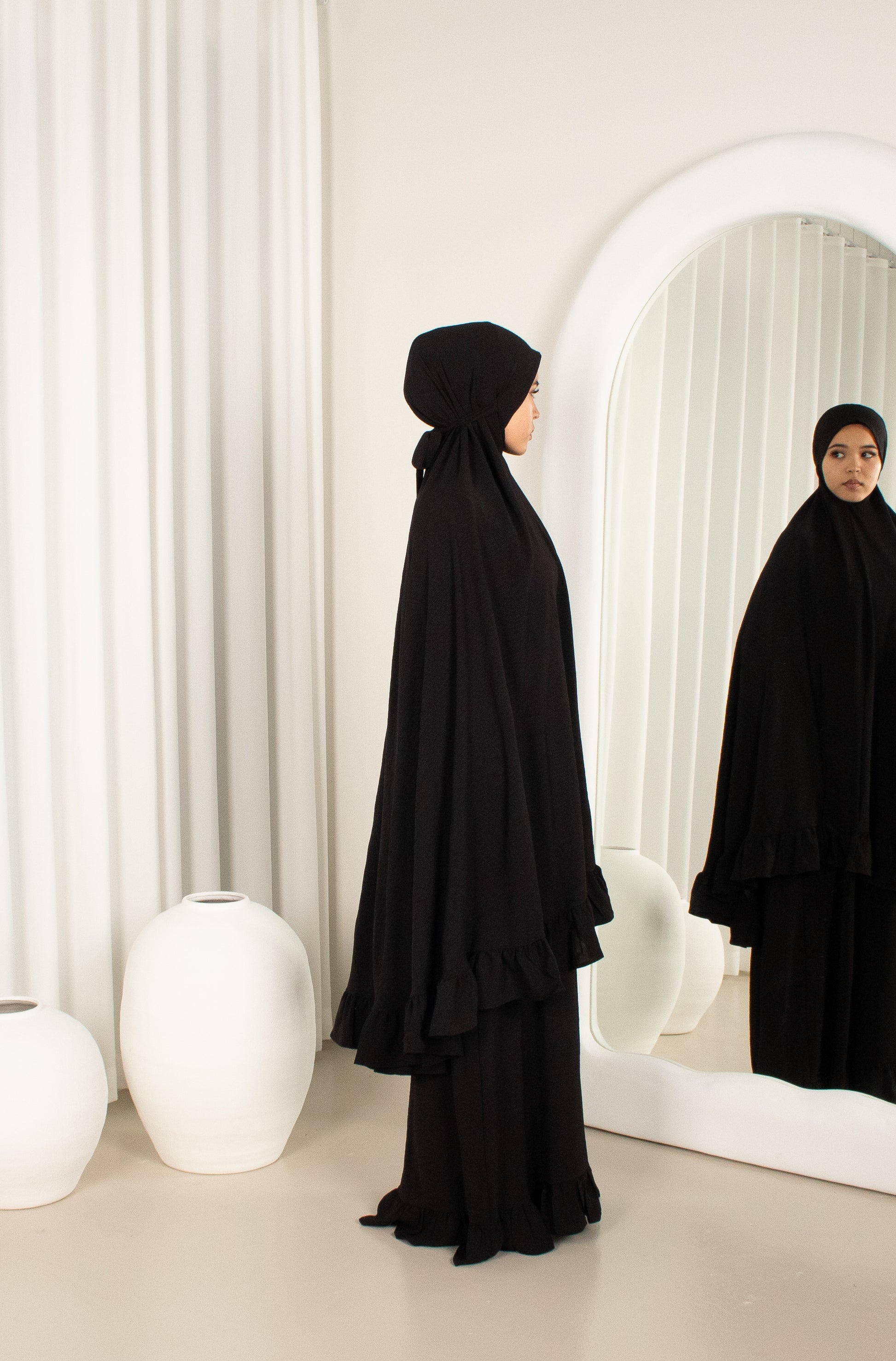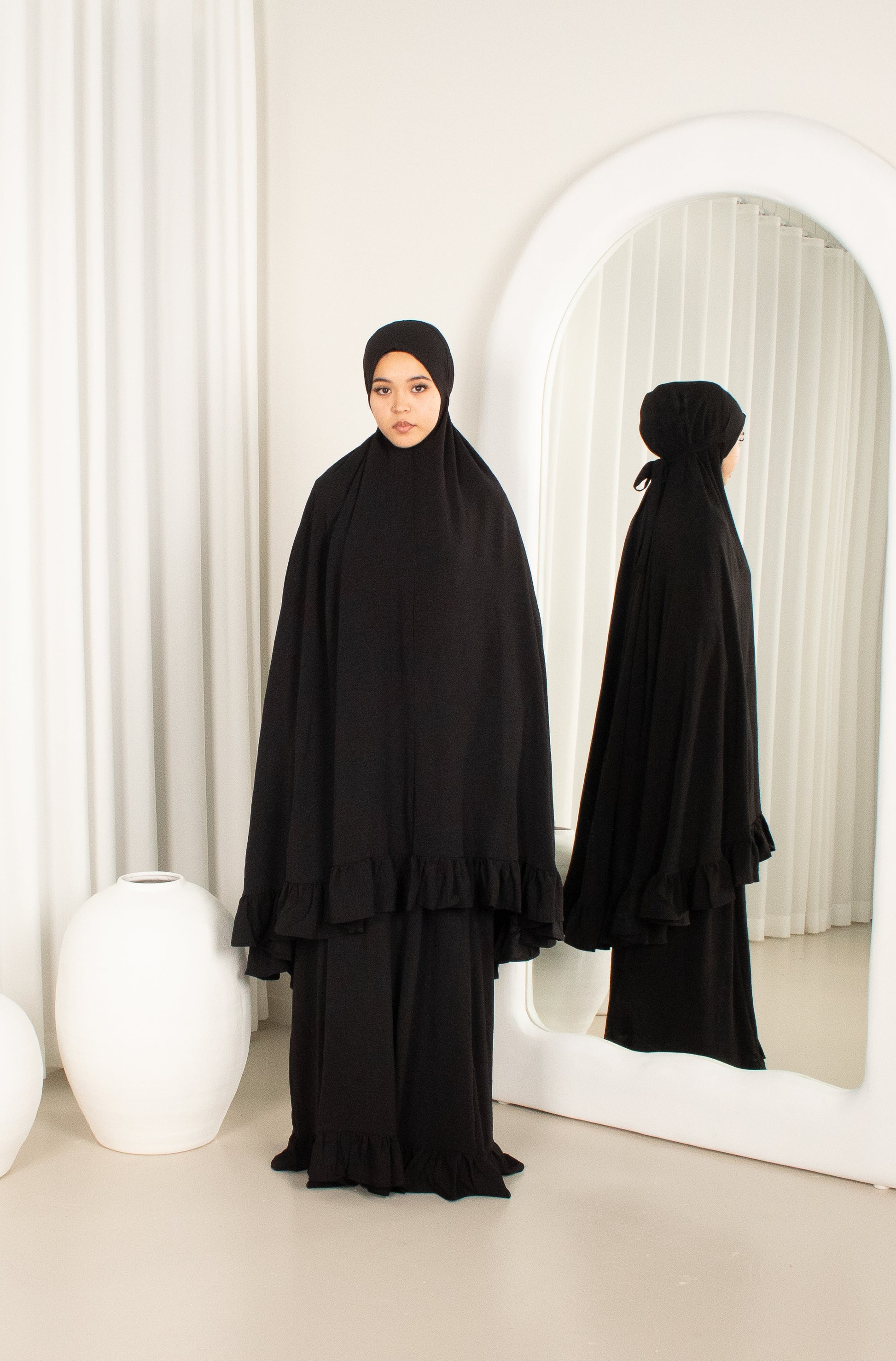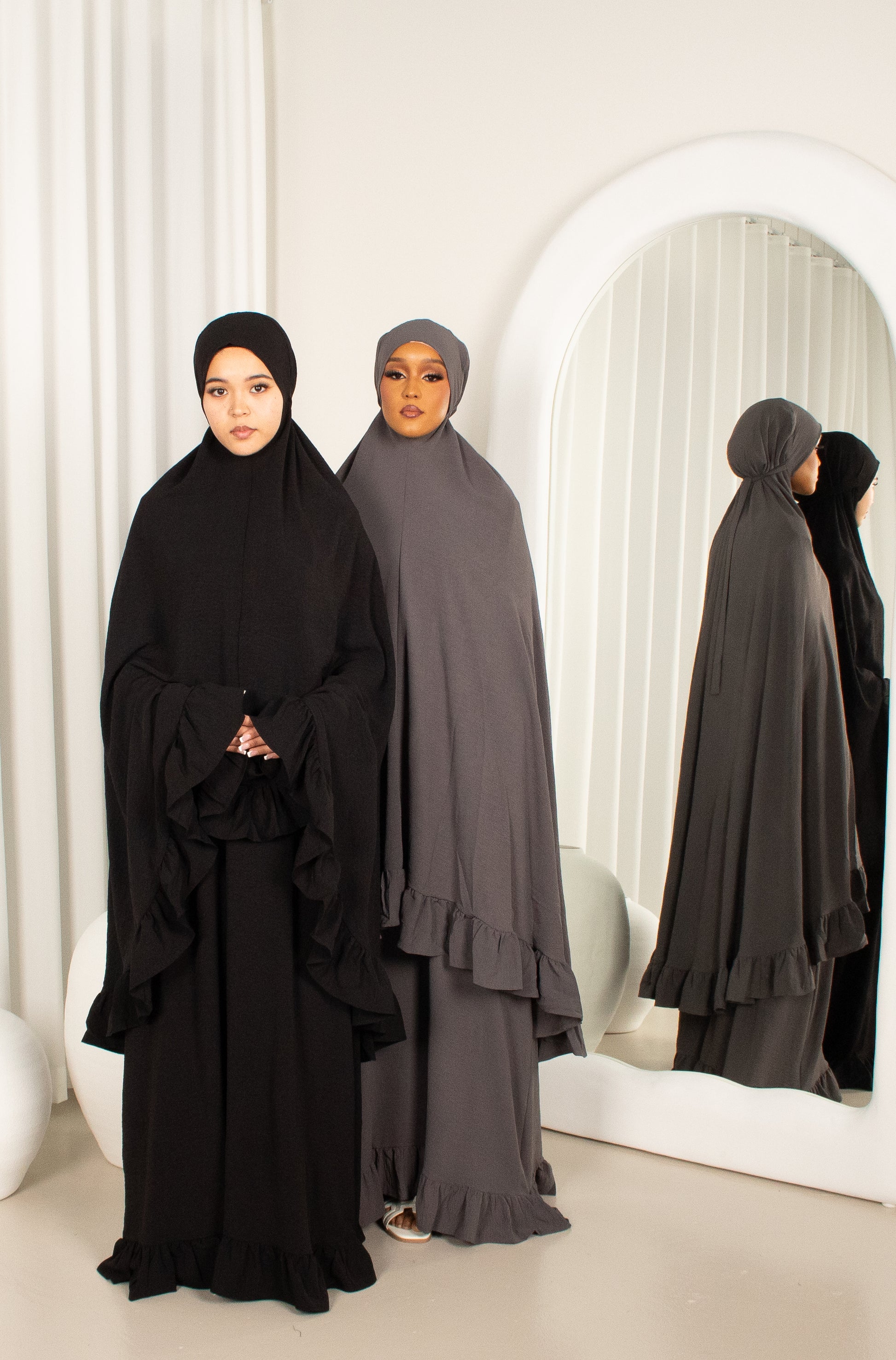 Introducing our new Anam Prayer Set, made from a super soft light crepe material. It features tie-back detail long jilbab and a long sleeve loose maxi dress. Perfect for your call to salah and for long Ramadan nights at Taraweeh.