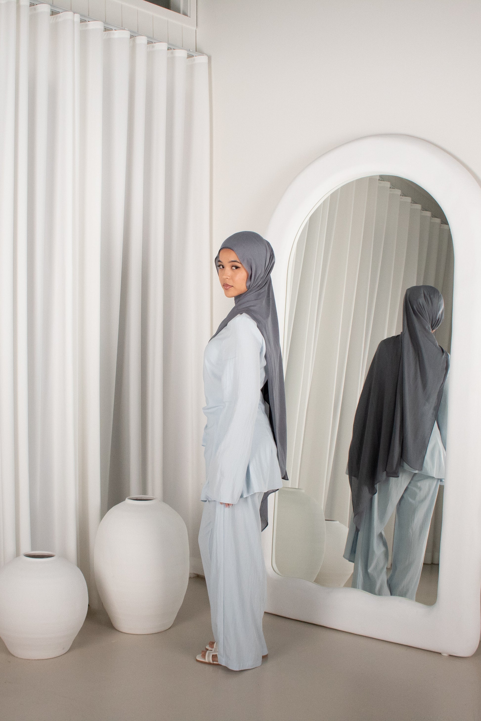 A relaxed yet refined two-piece set featuring a longline top with gentle side ruching and flowy wide-leg pants. A gorgeous Sky Blue to fit the Summer Tones! Designed with comfort and movement in mind, this set offers an effortless silhouette that’s perfect for everyday wear or elevated casual styling. Lightweight, modest, and easy to wear.