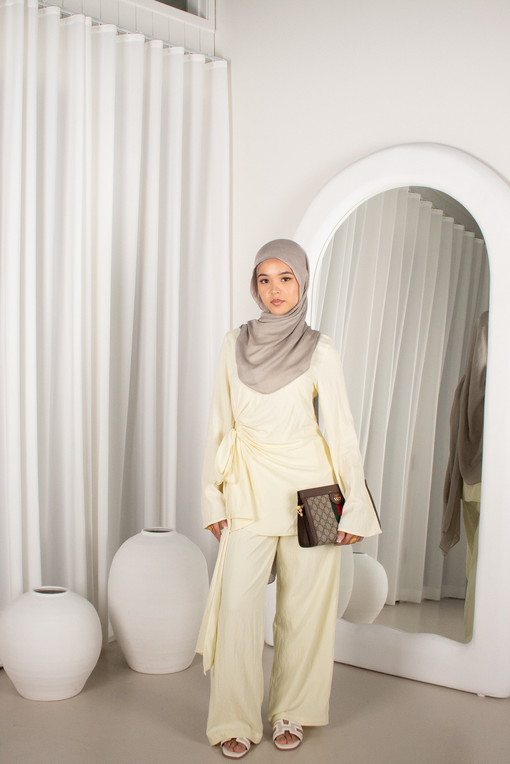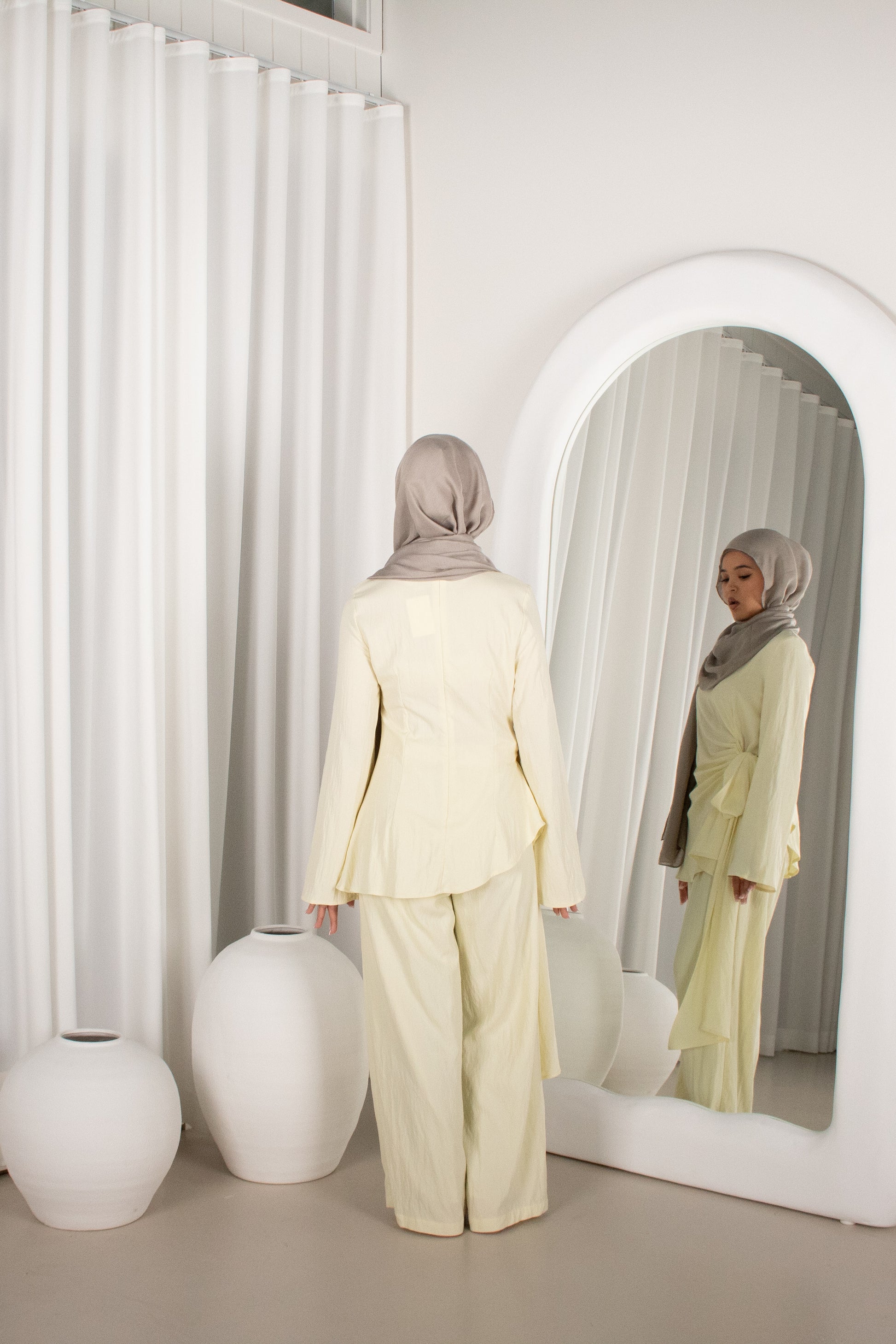 A relaxed yet refined two-piece set featuring a longline top with gentle side ruching and flowy wide-leg pants. A gorgeous Lemon Yellow to fit the Summer Tones! Designed with comfort and movement in mind, this set offers an effortless silhouette that’s perfect for everyday wear or elevated casual styling. Lightweight, modest, and easy to wear.