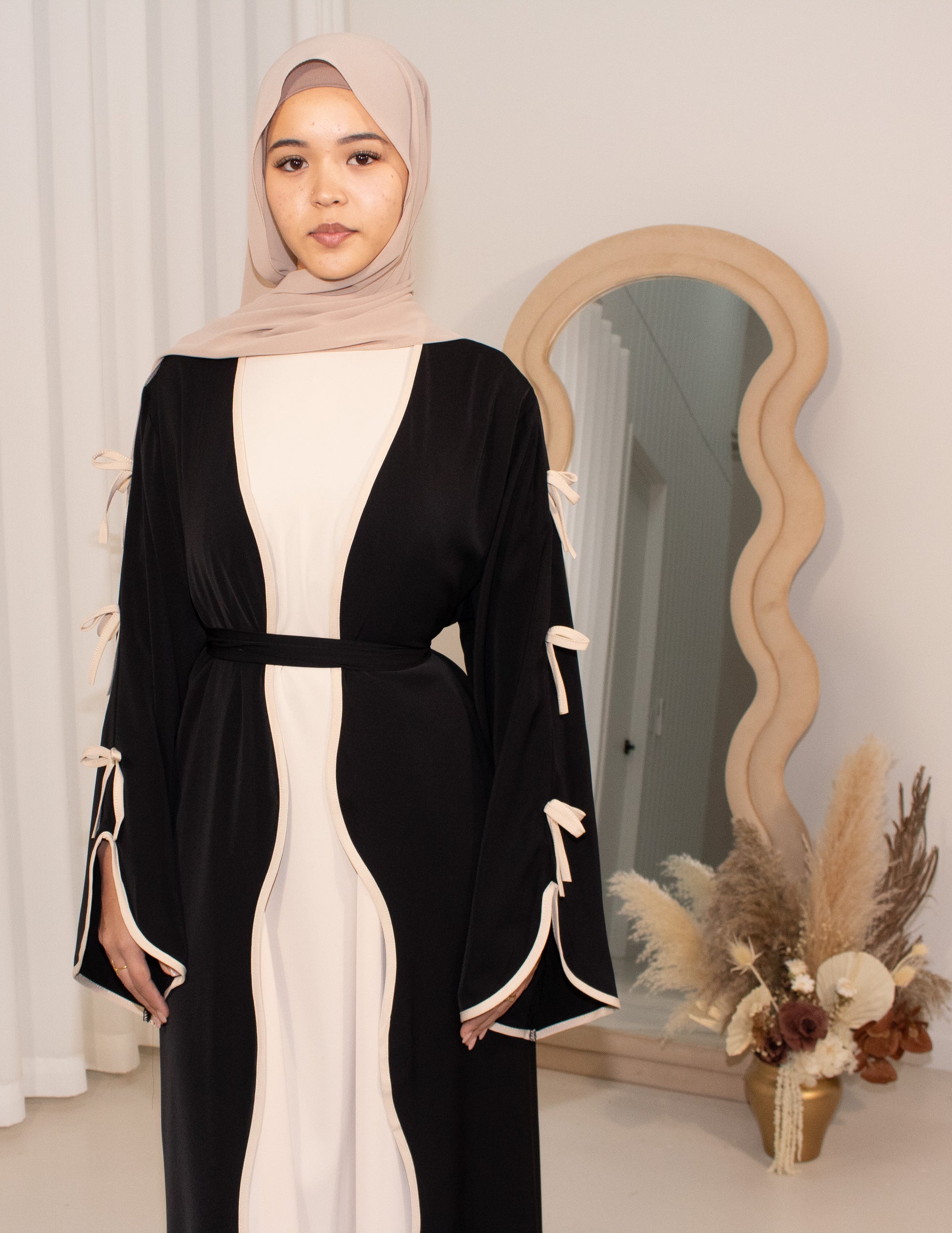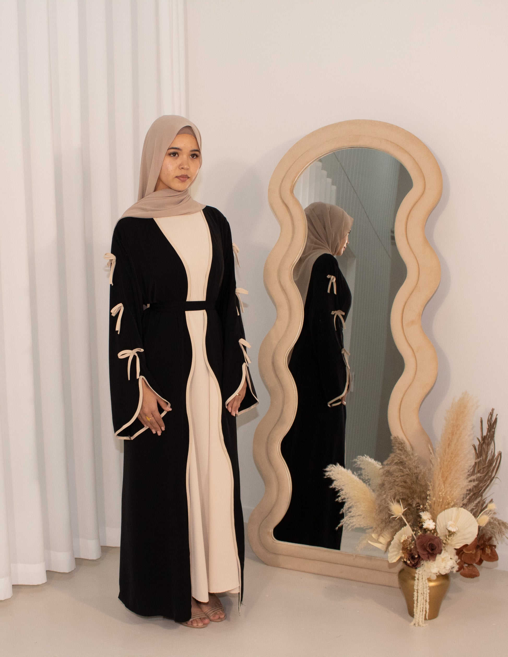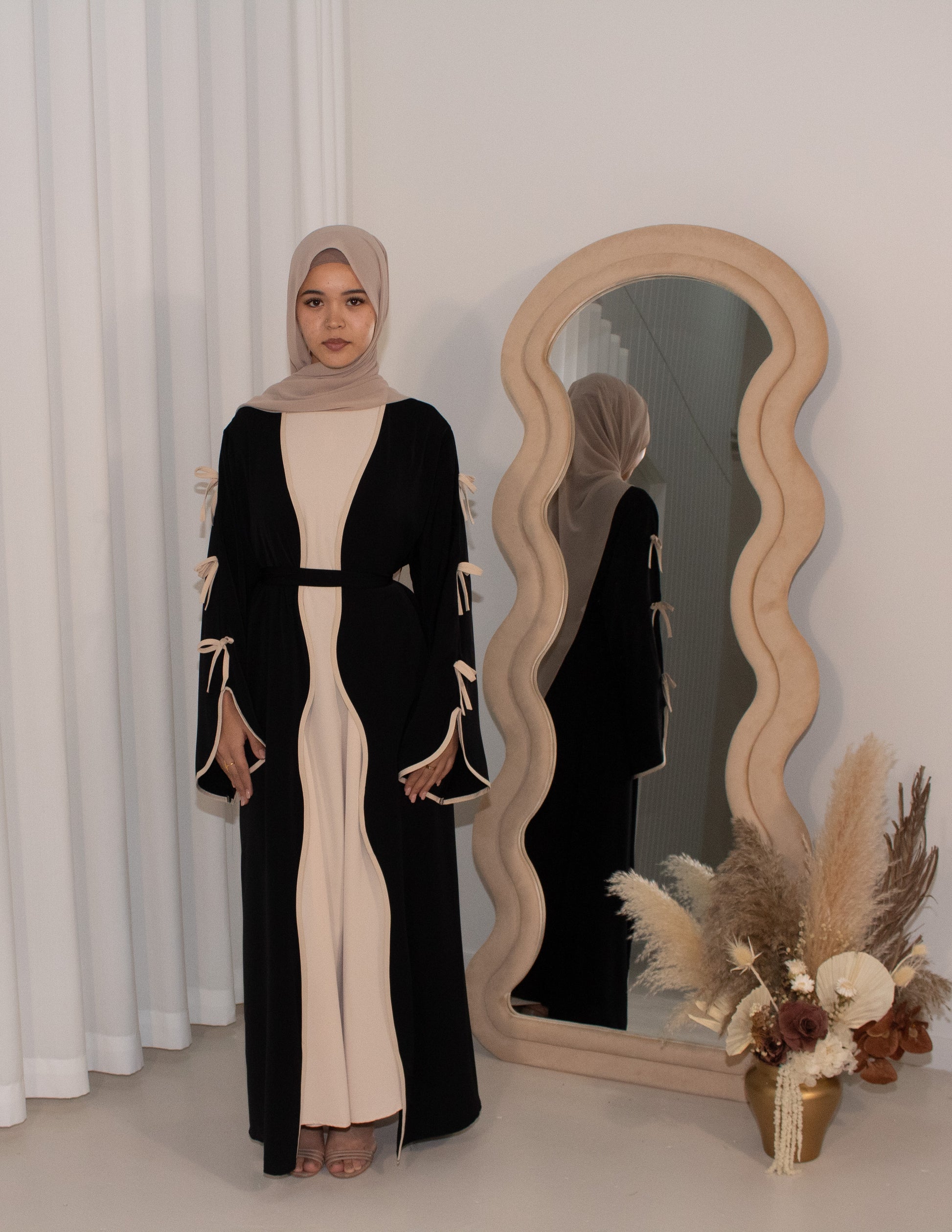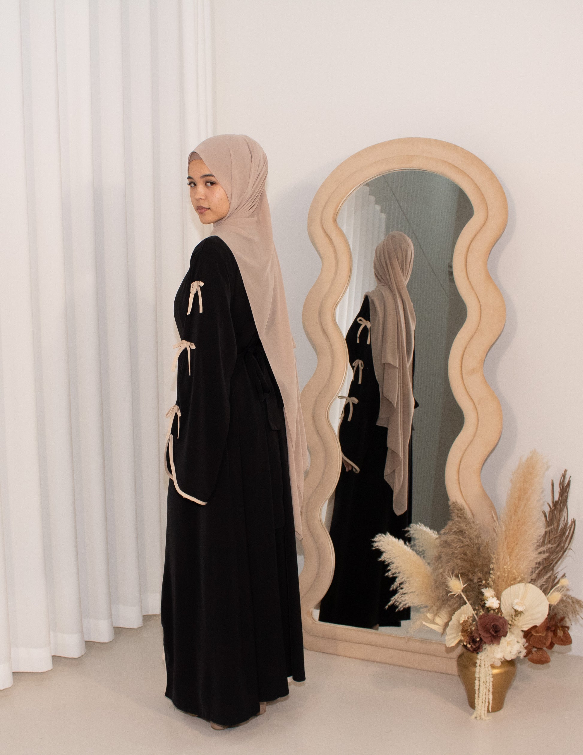 Look stunning while staying comfortable in Two Piece Bow Abaya Set! This stylish maxi dress is made of a satin-like fabric and features long sleeves, an attached waist tie, and matching cape to give that extra coverage. Can we worn with or without the cape.