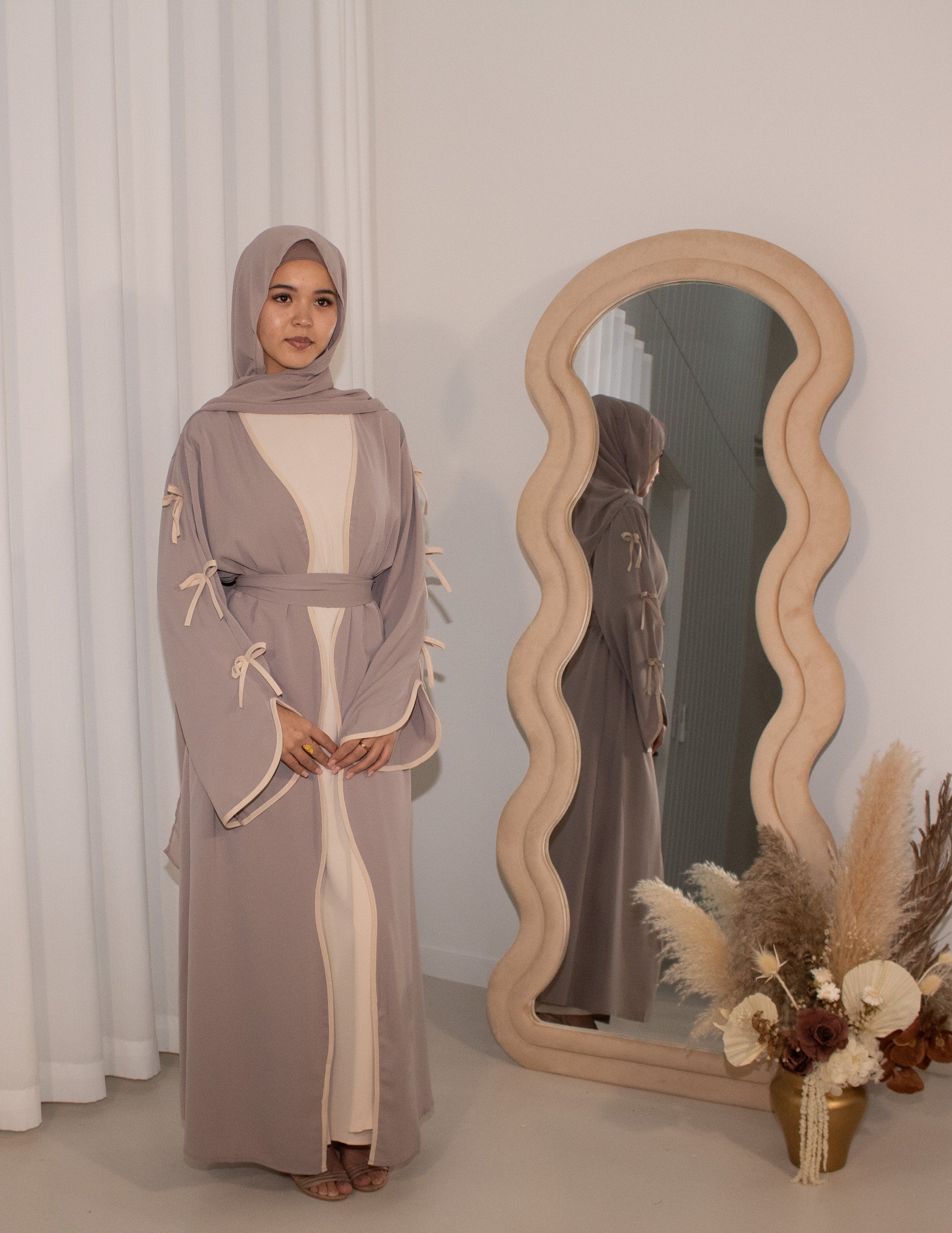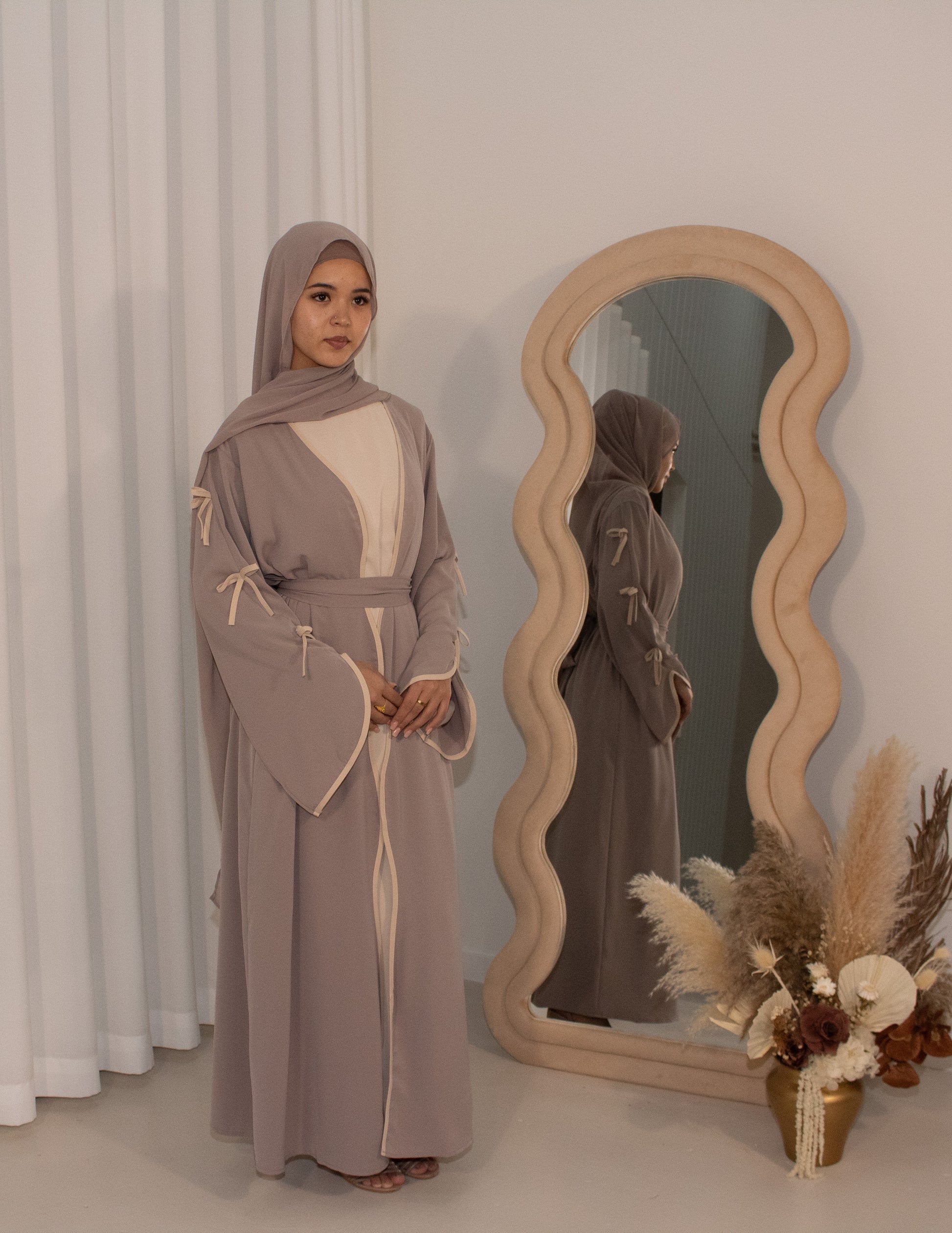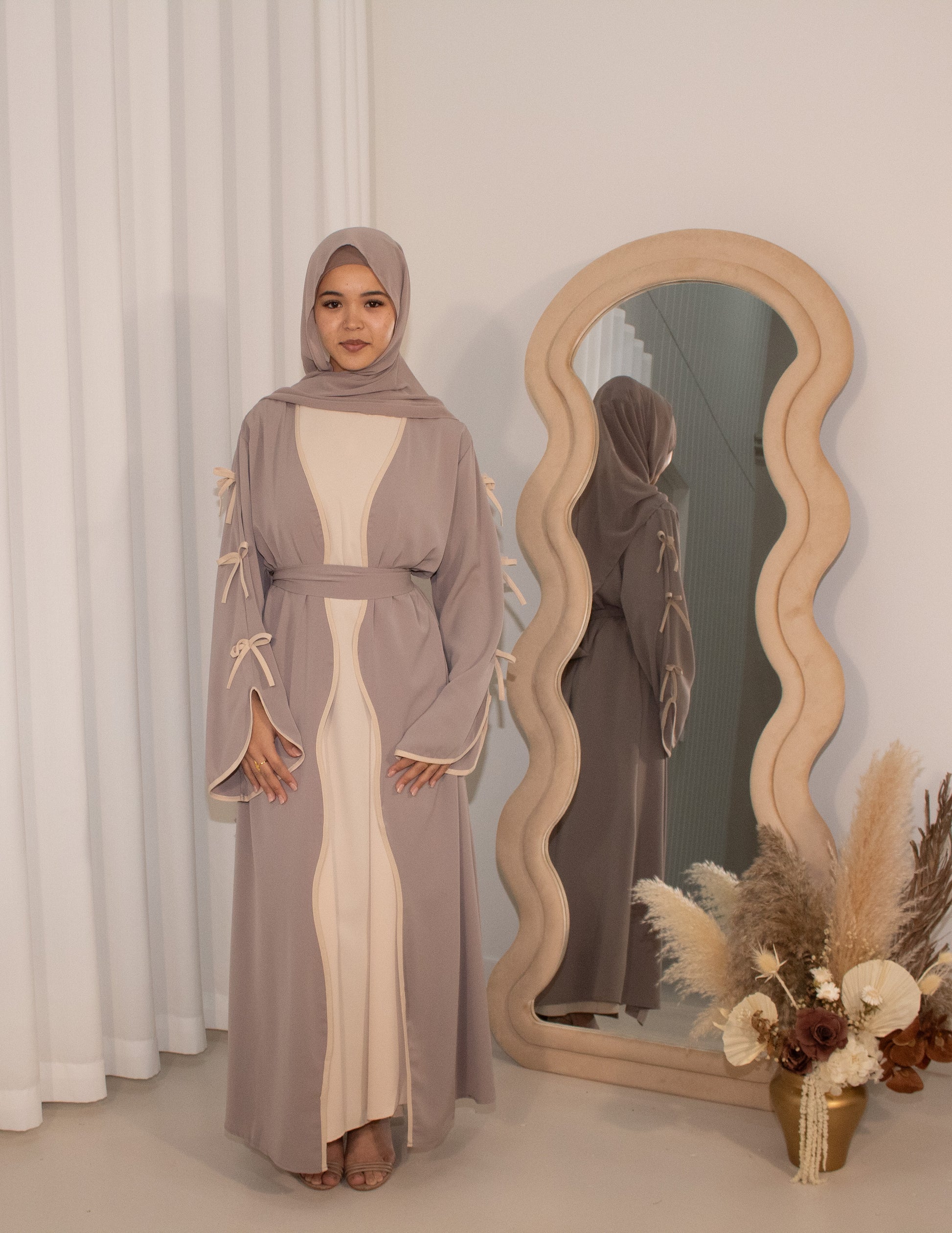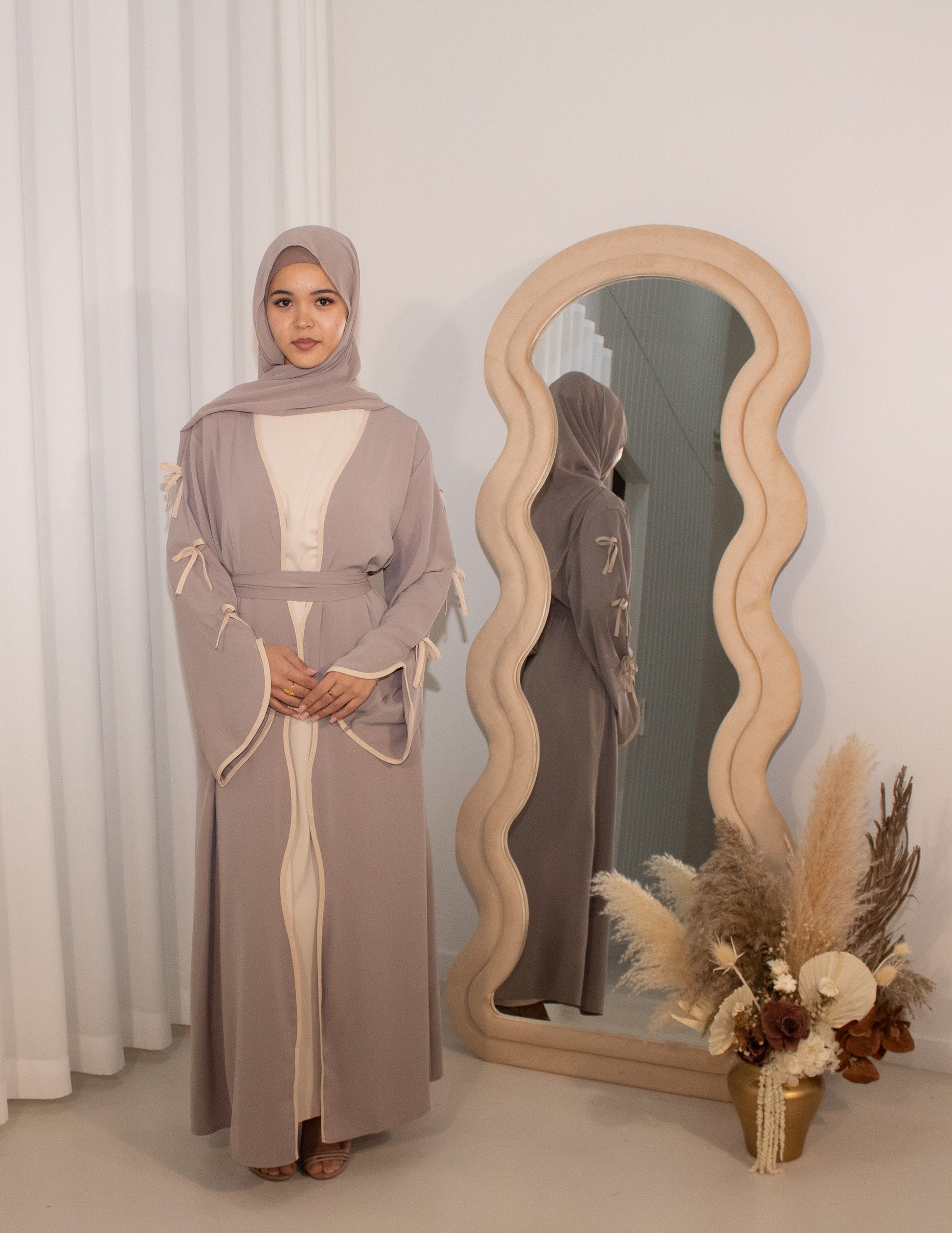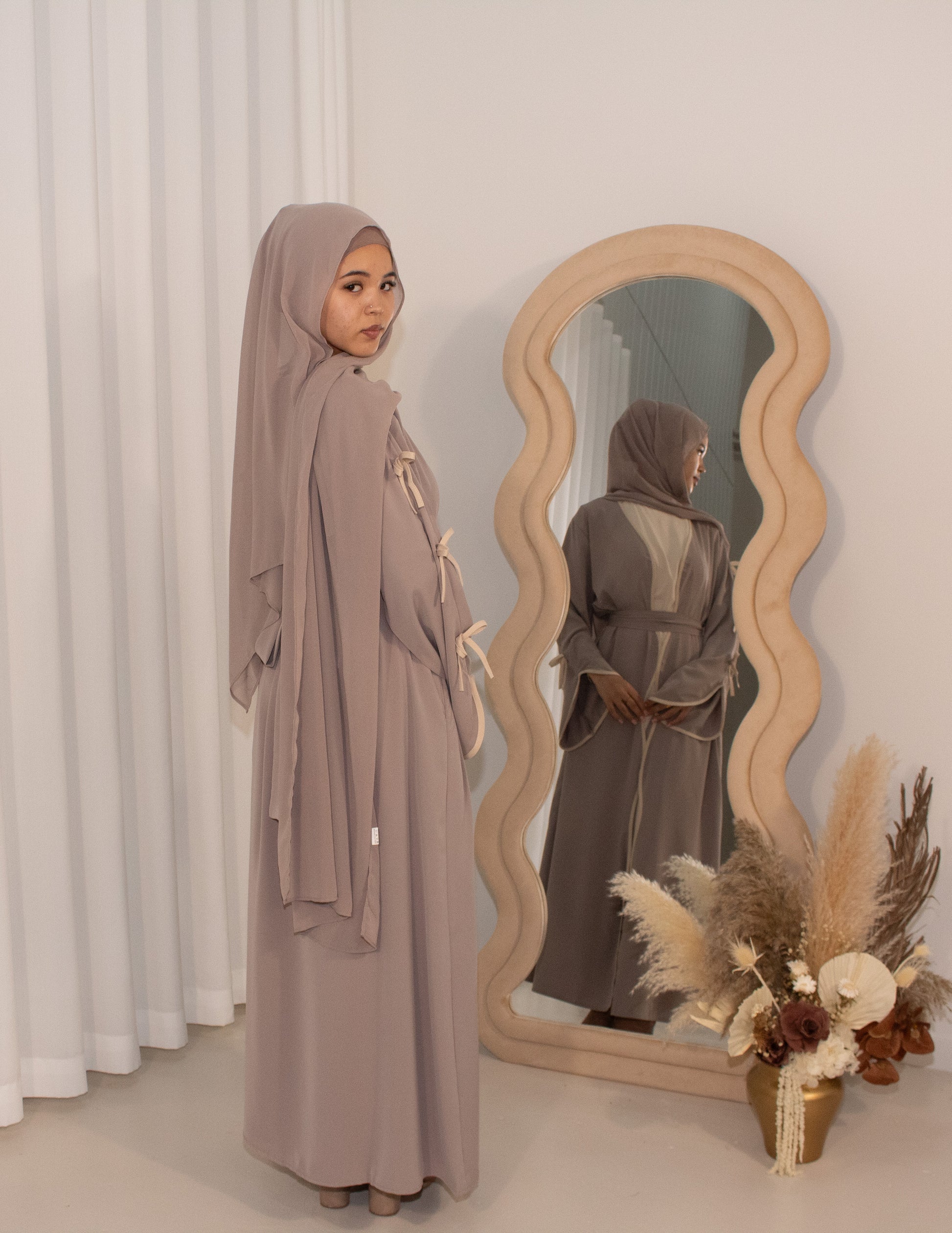 Look stunning while staying comfortable in Two Piece Bow Abaya Set! This stylish maxi dress is made of a satin-like fabric and features long sleeves, an attached waist tie, and matching cape to give that extra coverage. Can we worn with or without the cape.