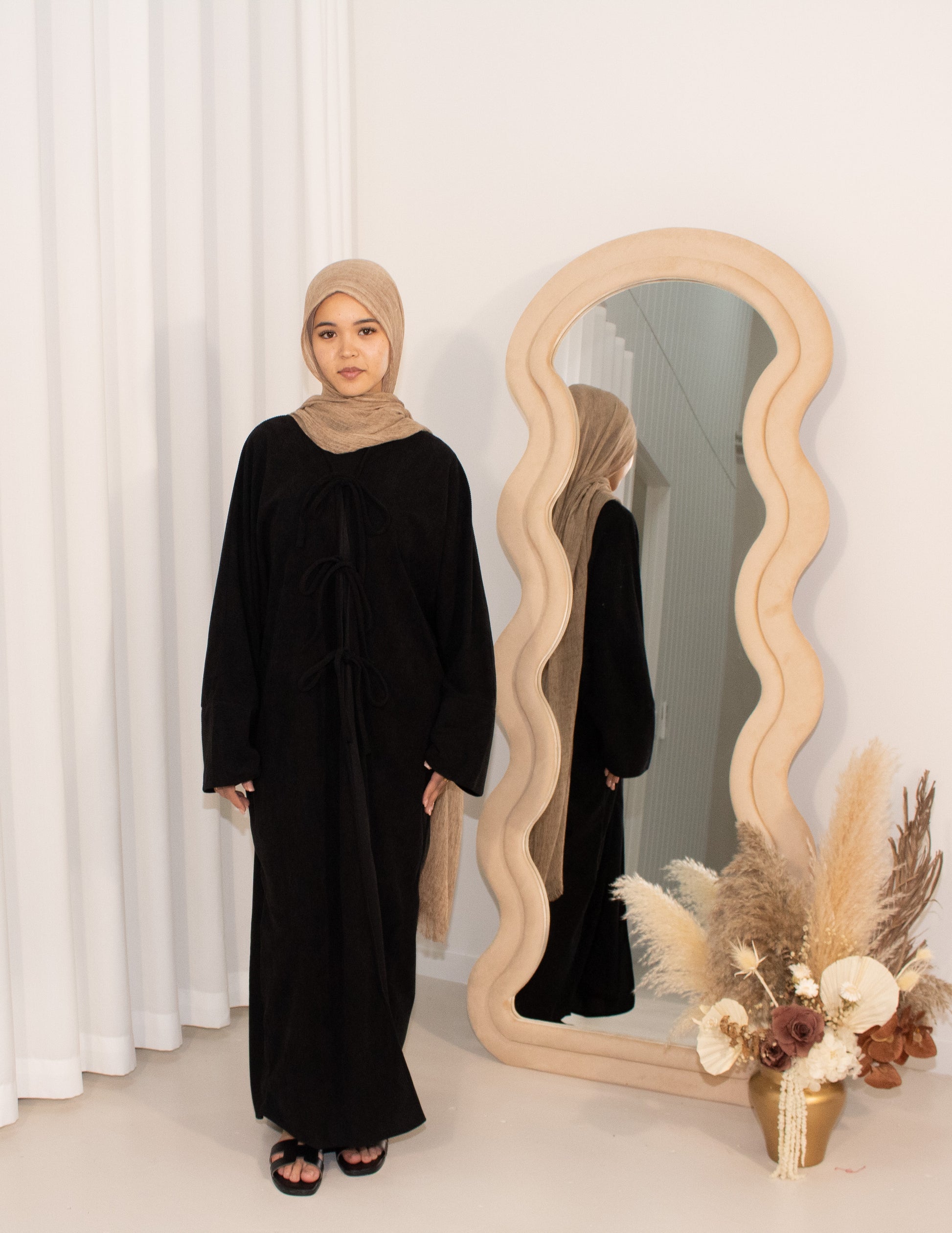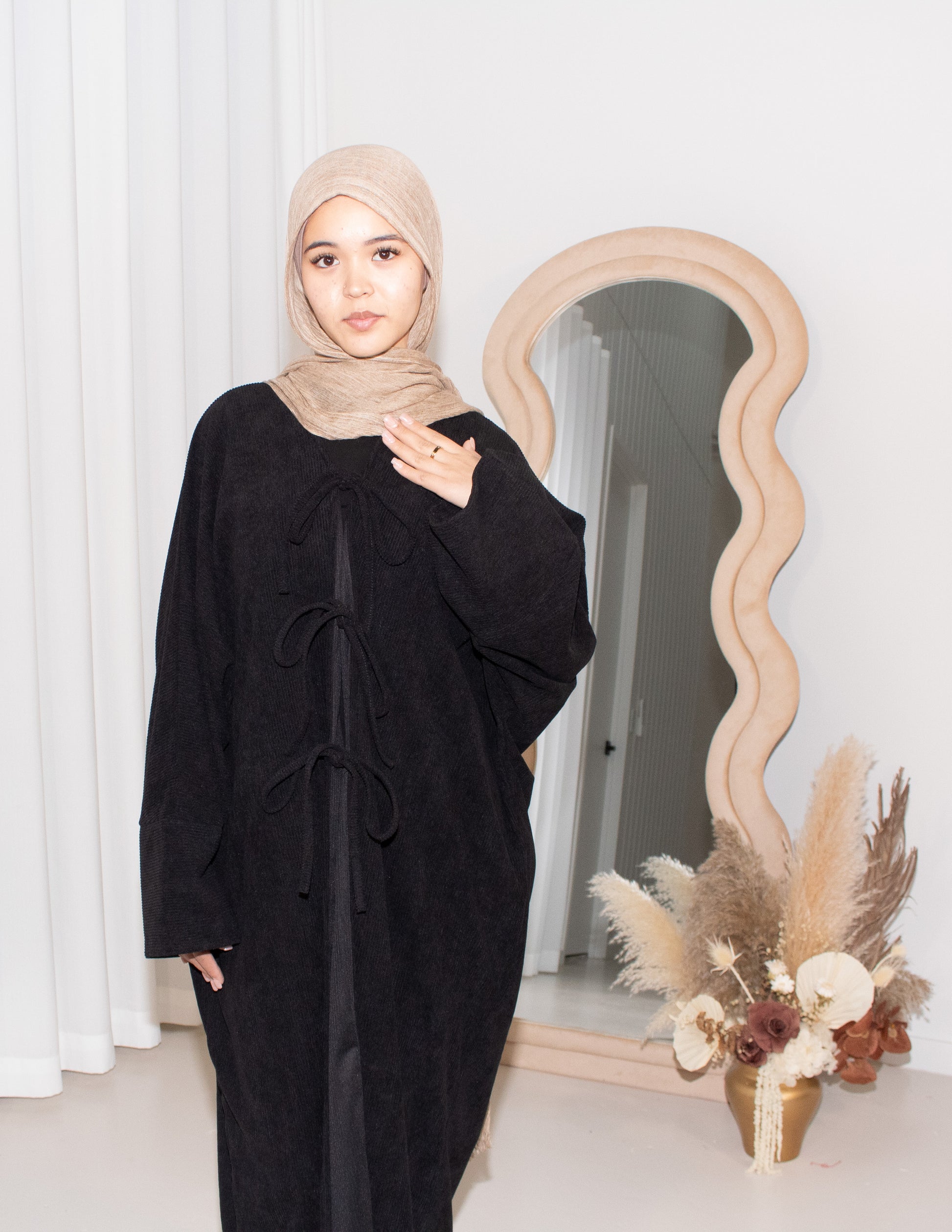 Look stunning while staying comfortable in our Corduroy self-tie Bow Cardigan! This stylish cardigan features long open sleeves and front tie.