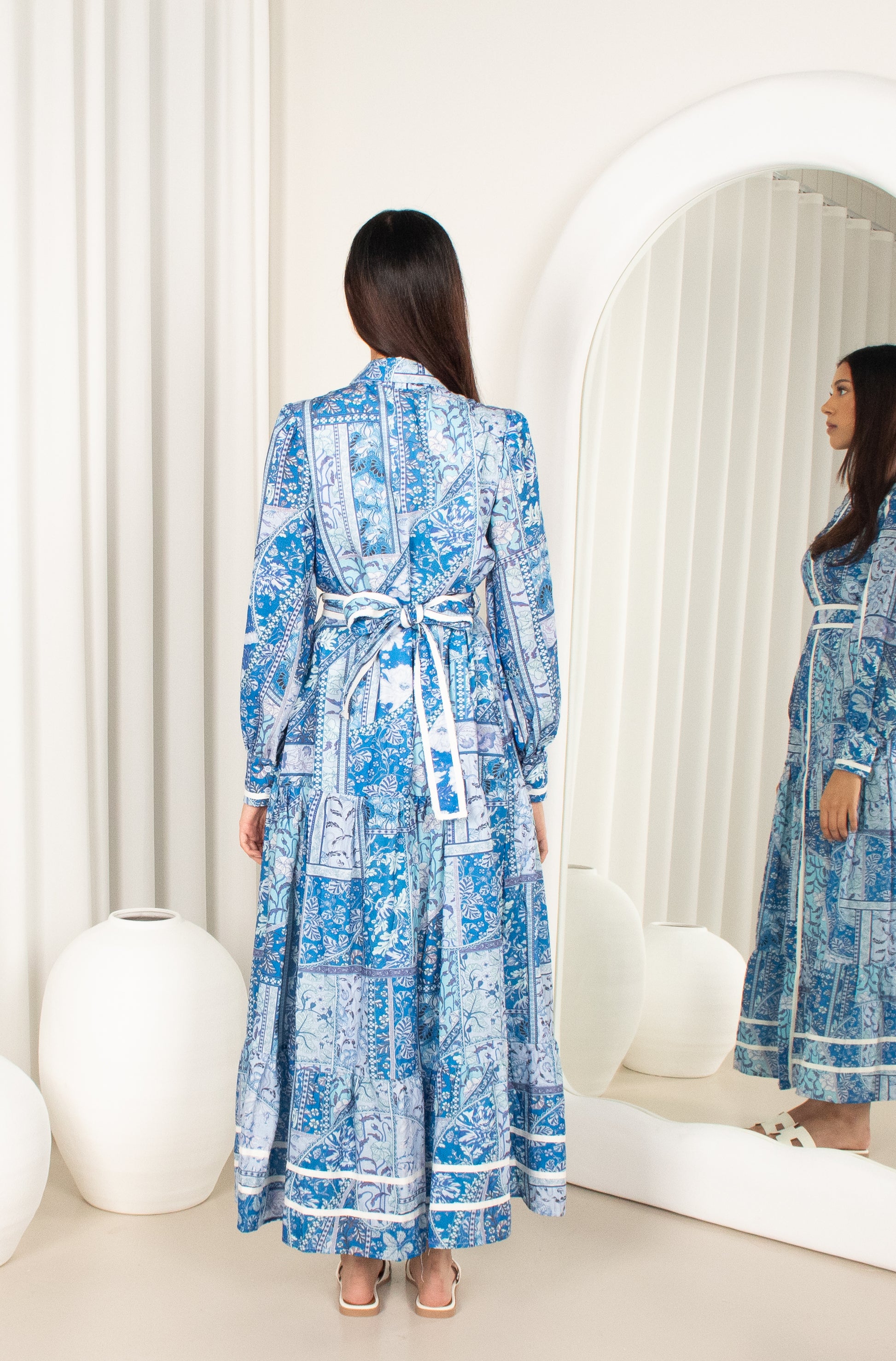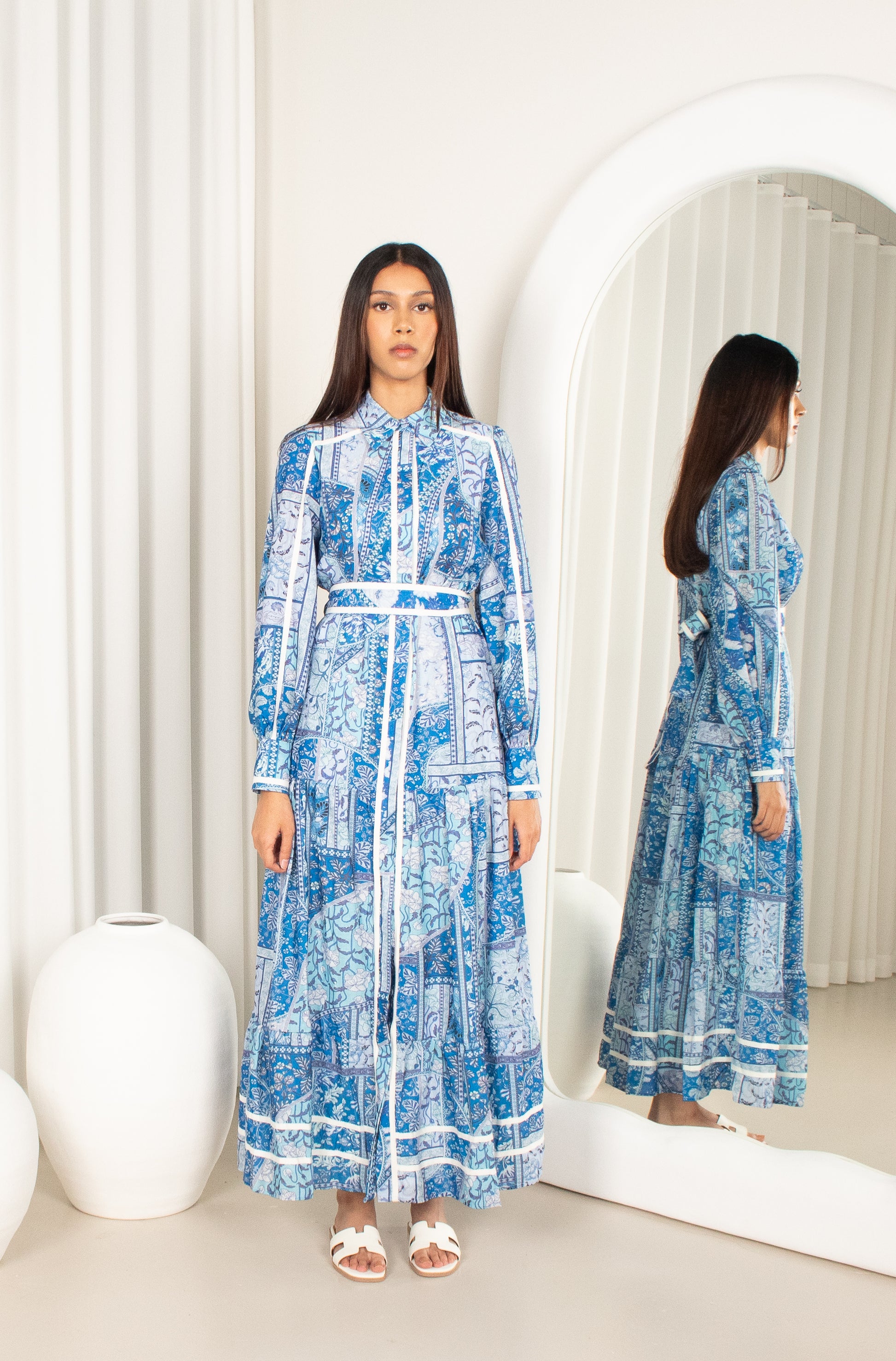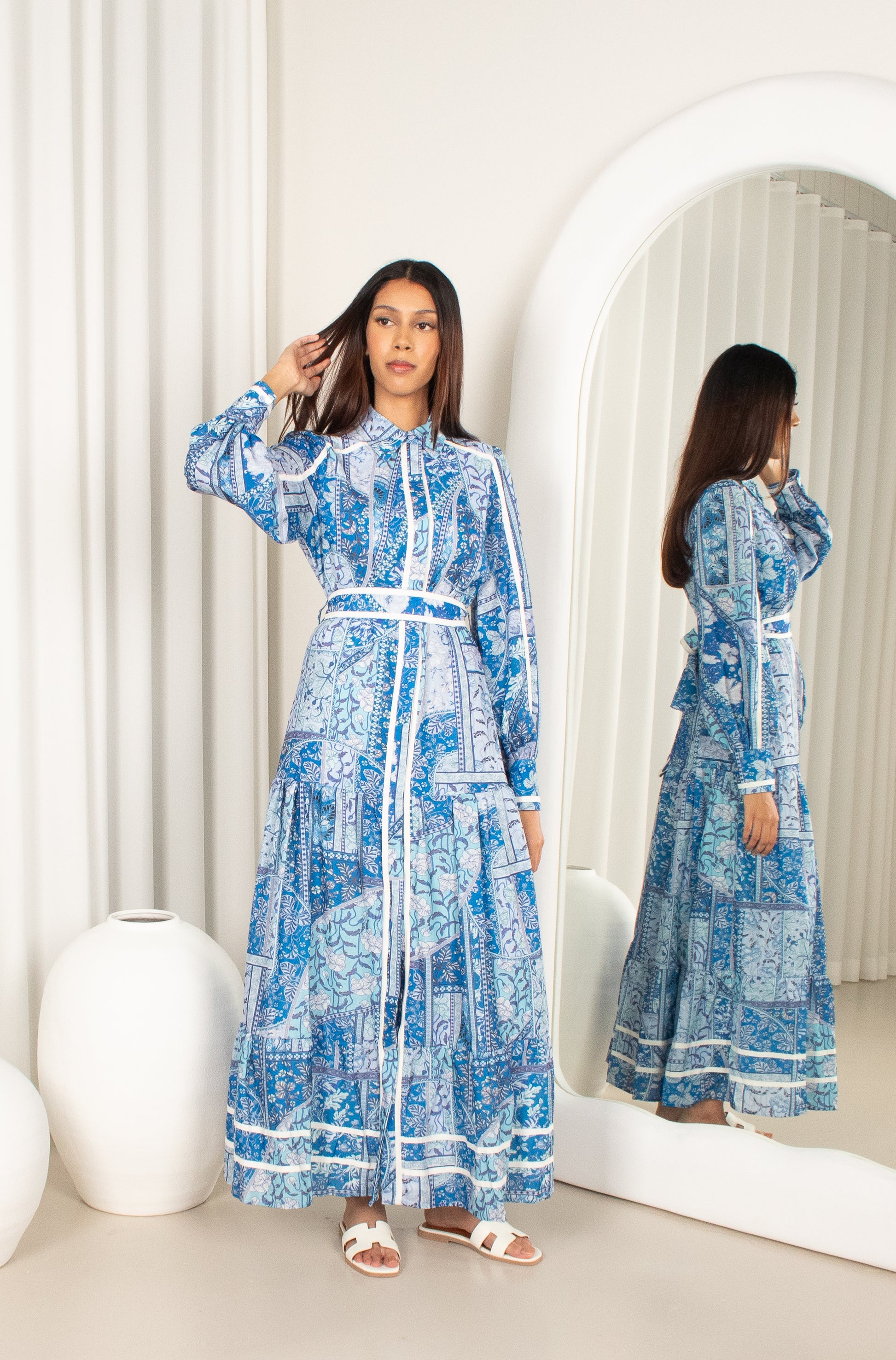 Stunning uniquely design flowy dress with cinched waist detailed, long relaxed sleeves, elastic gathered cuffs and pockets.