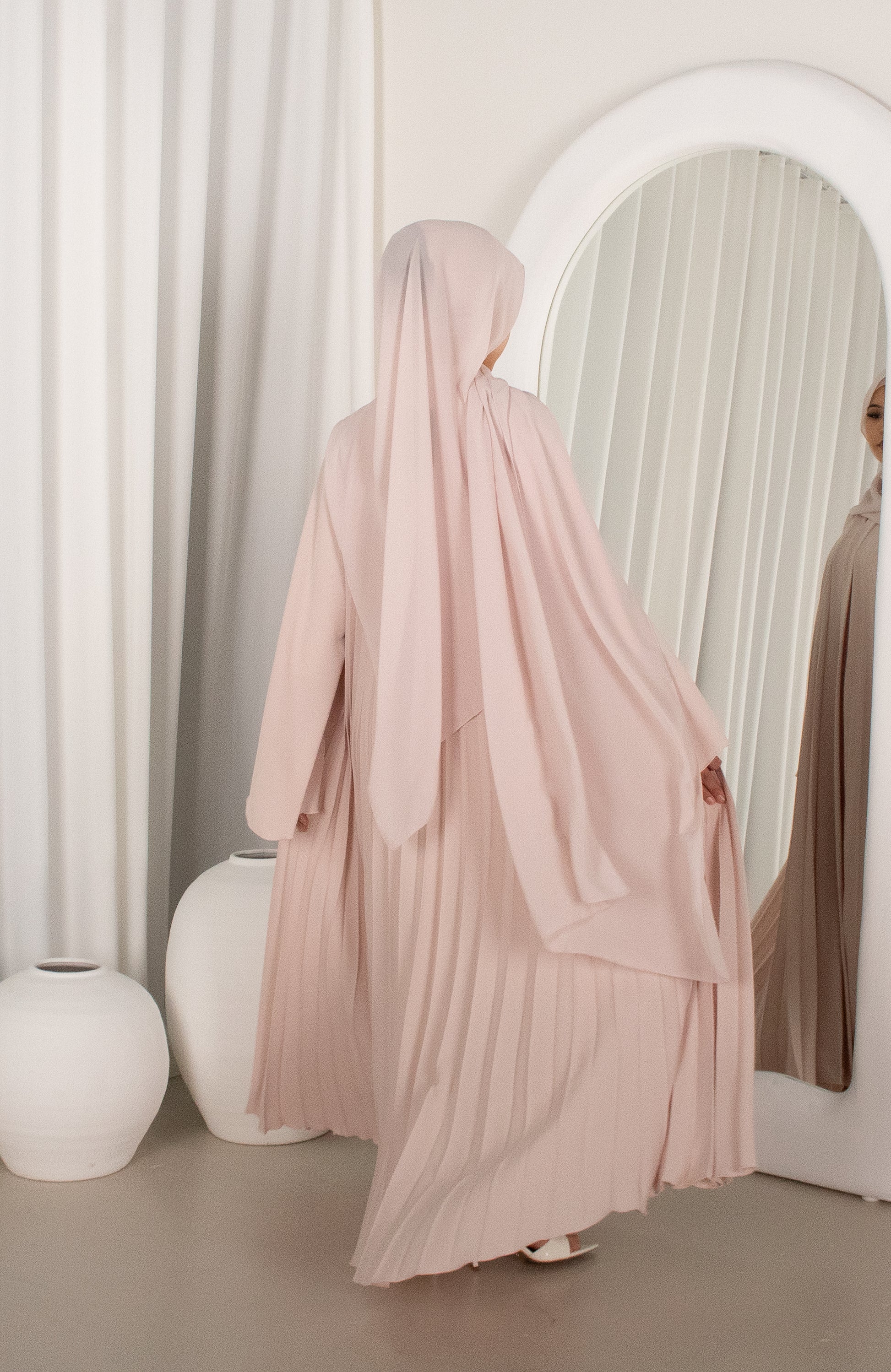 This elegant abaya made in the U.A.E features a flattering A-line cut with soft pleated detailing that flows beautifully from the shoulders. Designed with umbrella-style sleeves for graceful movement and full coverage, and finished with a buttoned-up front for a clean, modest look. The lightweight fabric drapes smoothly and comfortably. Comes with a matching scarf for a complete, coordinated outfit.