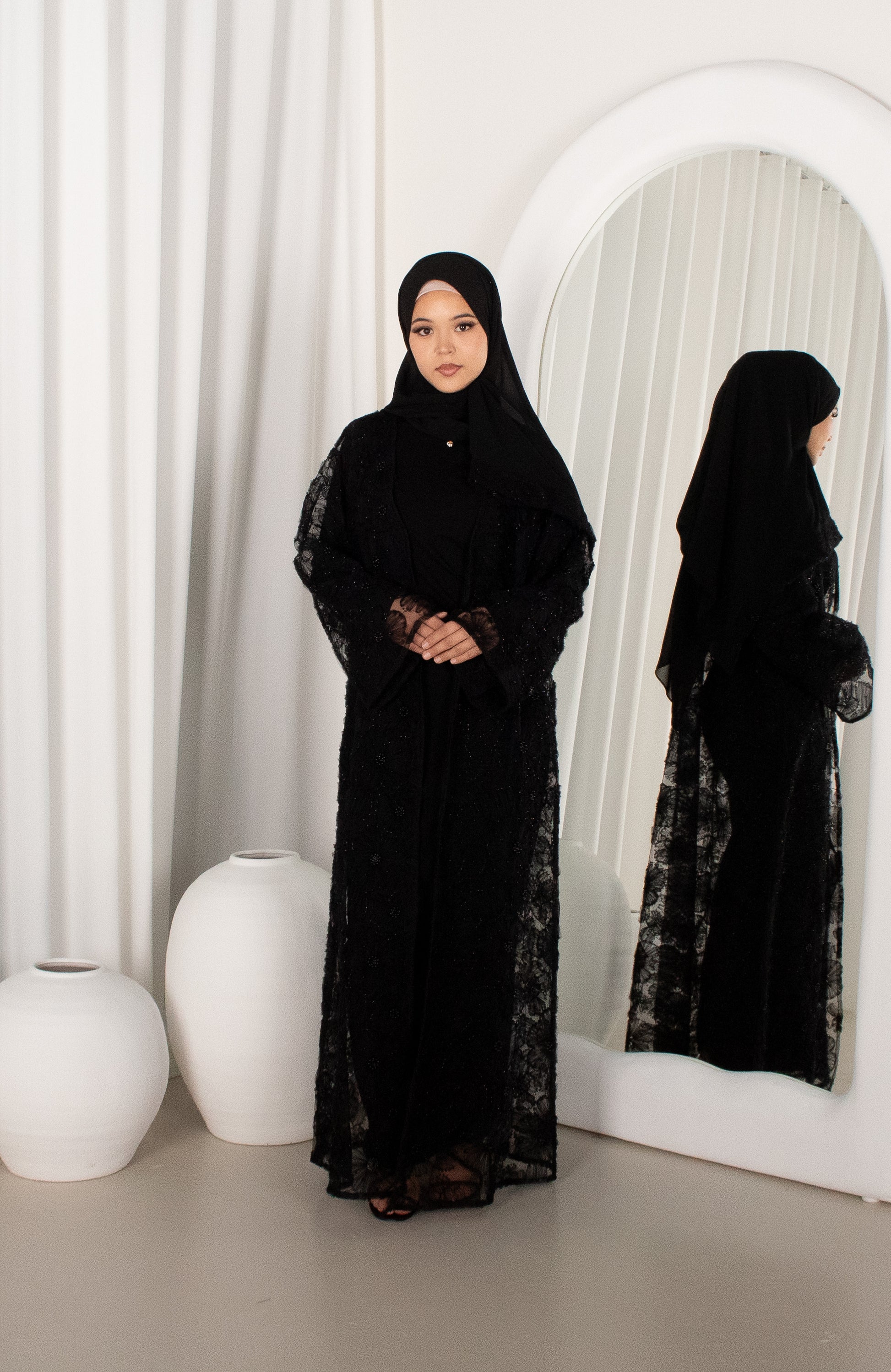 This statement open abaya is crafted from delicate sheer lace, adorned with intricate floral appliqué and subtle beaded detailing that catches the light with every movement. Designed in a relaxed, flowing silhouette, it features wide sleeves that enhance its soft drape and create an effortlessly elegant finish. The full-length cut offers graceful coverage, making it perfect for layering over a simple inner dress for elevated evening wear or special occasions. Refined yet striking, this piece embodies timeless modest luxury. This Open Abaya comes with a matching hijab. The Abaya requires a full length inner piece, sold separately.