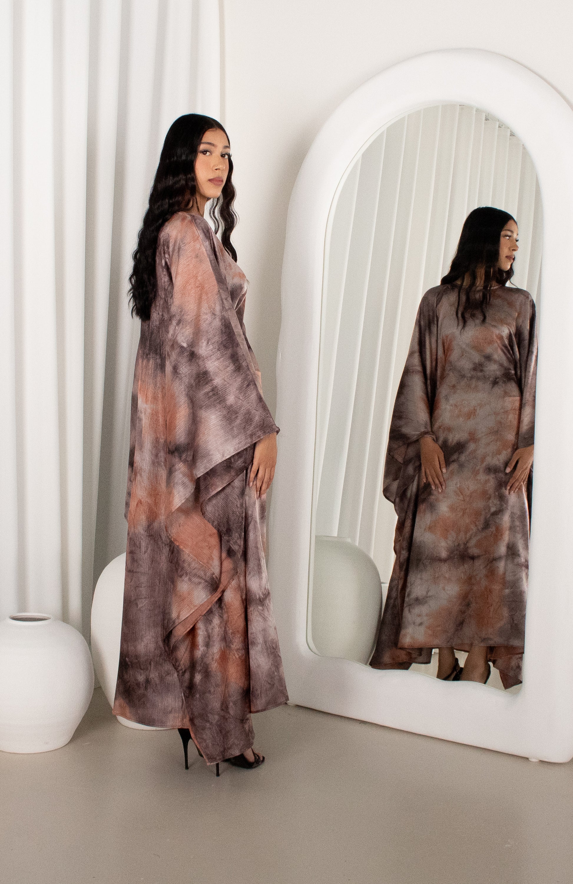This elegant maxi dress is designed in a fluid, satin-like fabric featuring a rich marbled blend of warm mocha, cocoa, and soft bronze tones. The softly fitted silhouette skims the body, while the round neckline keeps the look refined and minimal. Dramatic draped sleeves cascade effortlessly from the shoulders, creating graceful movement and an elevated, statement finish. The asymmetrical hemline enhances the flow of the fabric, making this piece perfect for evening occasions or sophisticated gatherings. Bold yet timeless, it blends modern artistry with modest elegance.