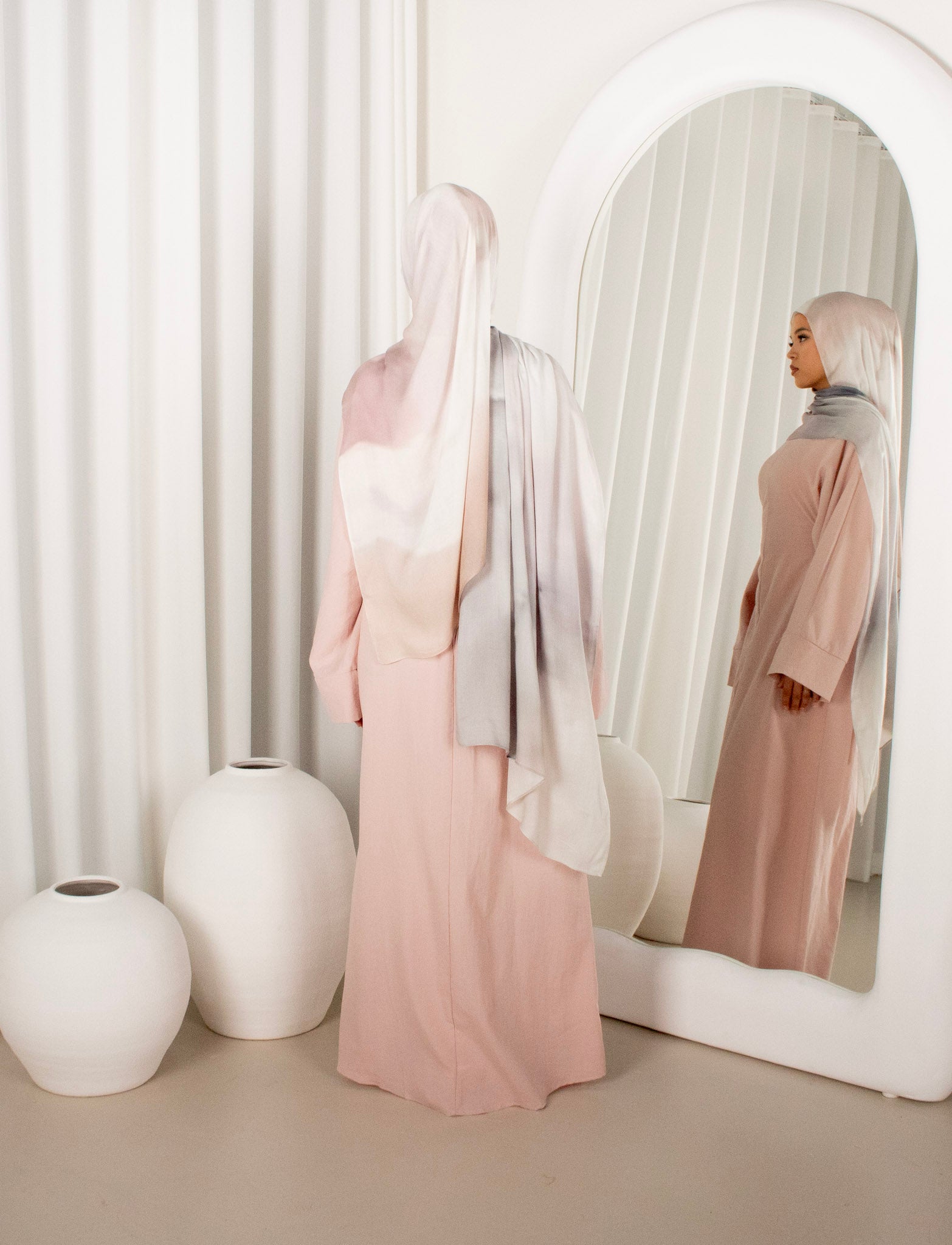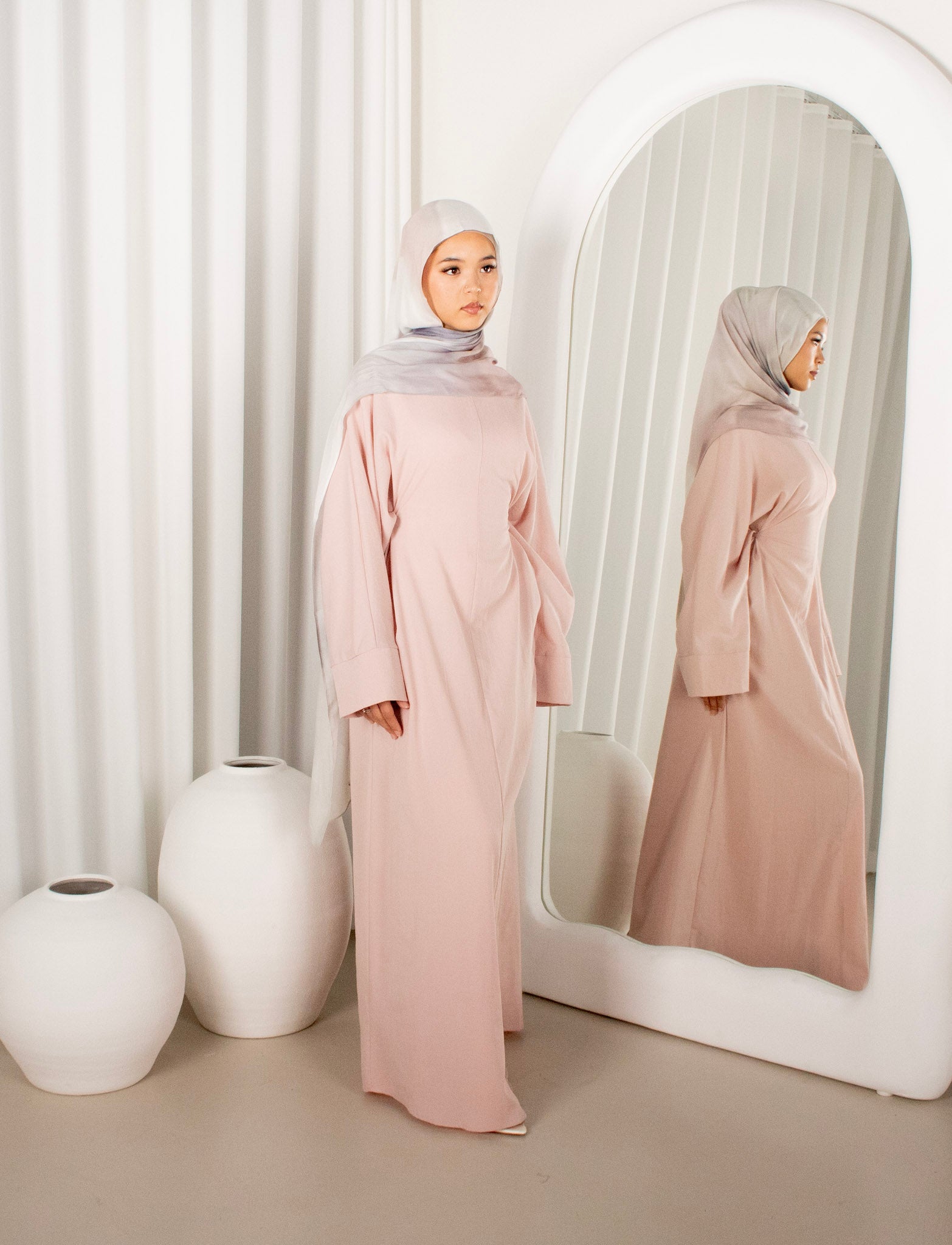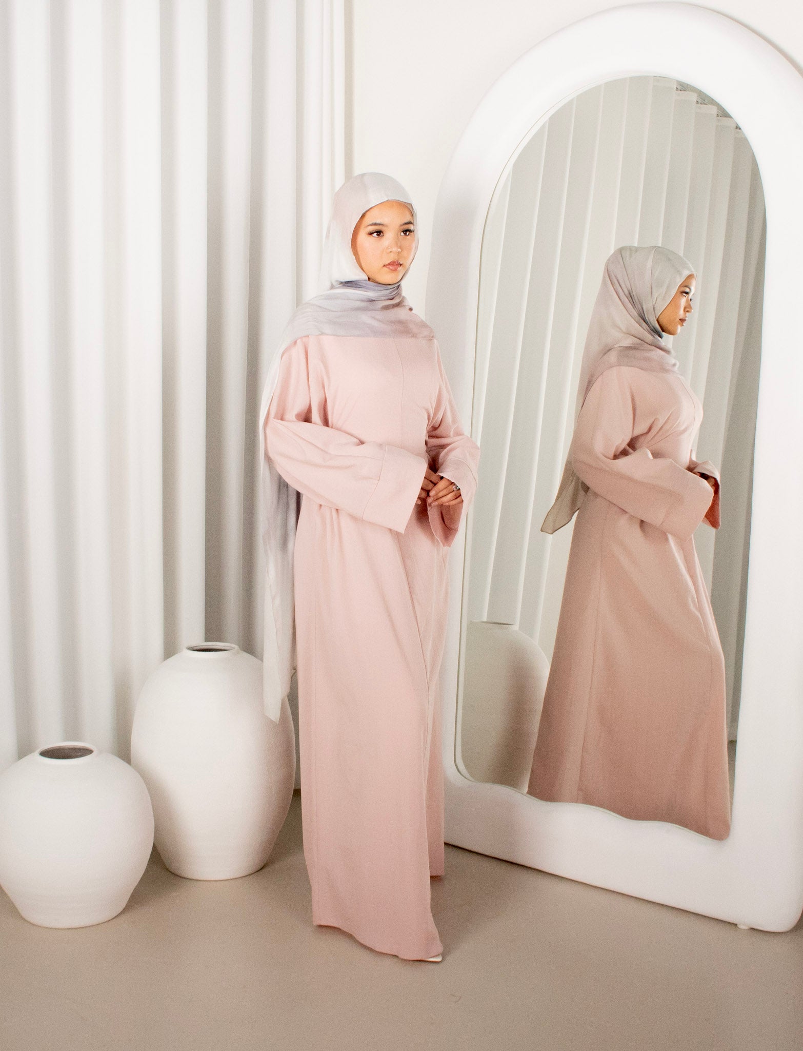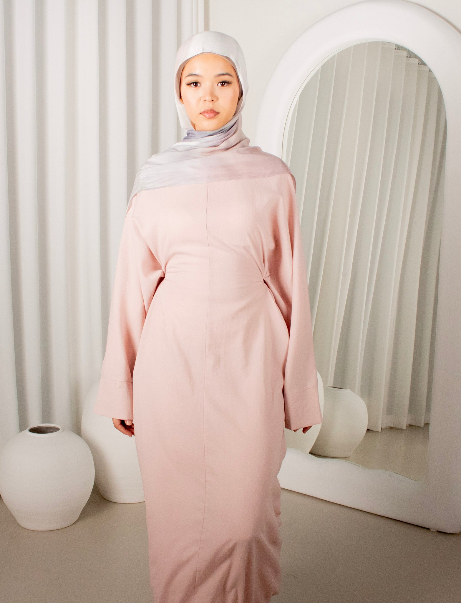 This minimalist dress embodies modern elegance with its clean lines and soft blush pink tone. Crafted from a structured yet flowy fabric, it features a modest full-length silhouette with wide, tailored sleeves and subtle seam detailing that adds a refined touch. The belt is uniquely designed at the front of the waist and ties at the back.