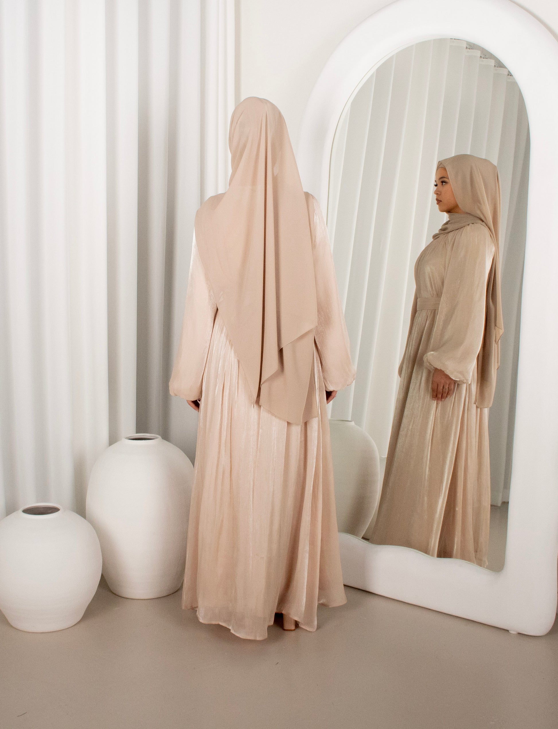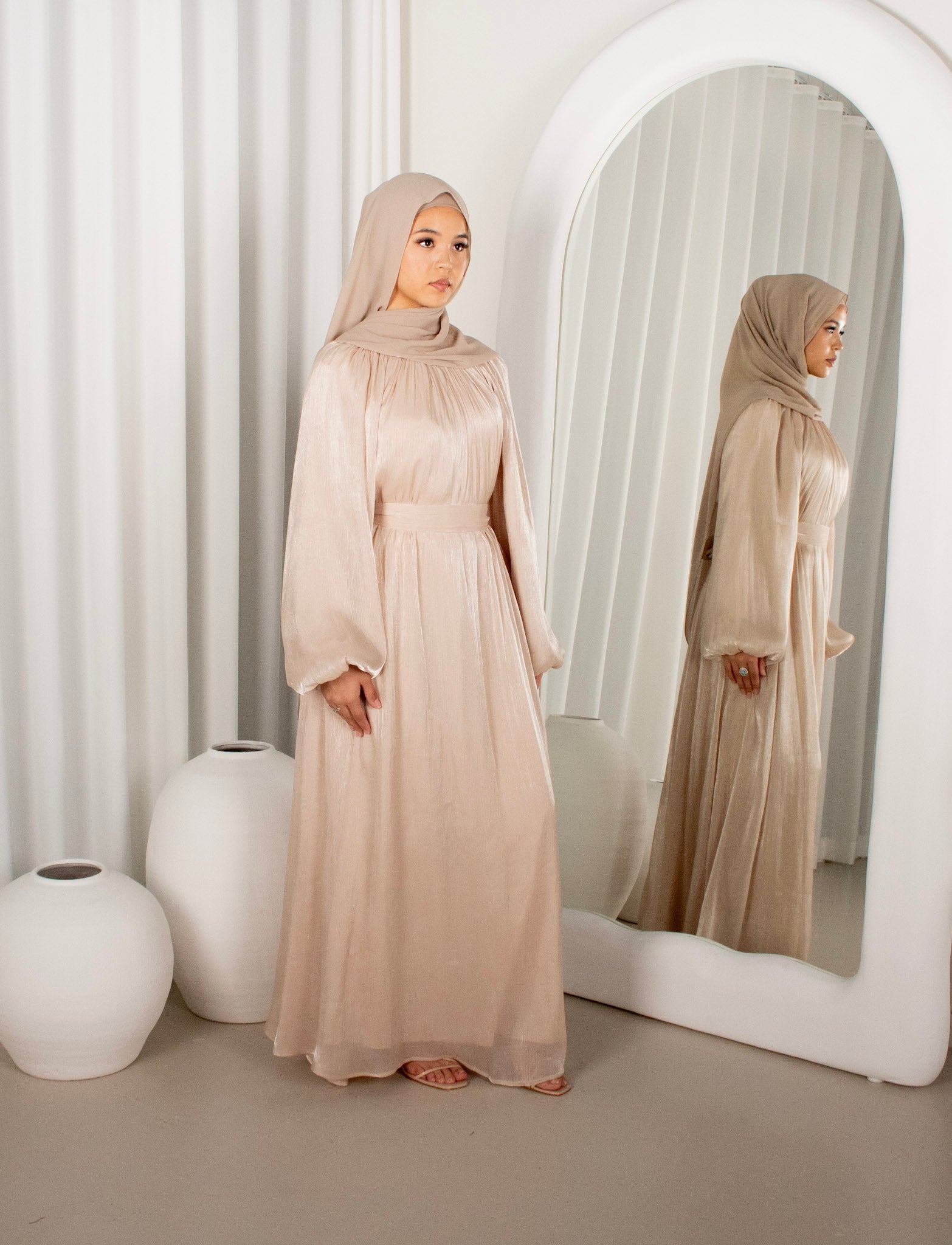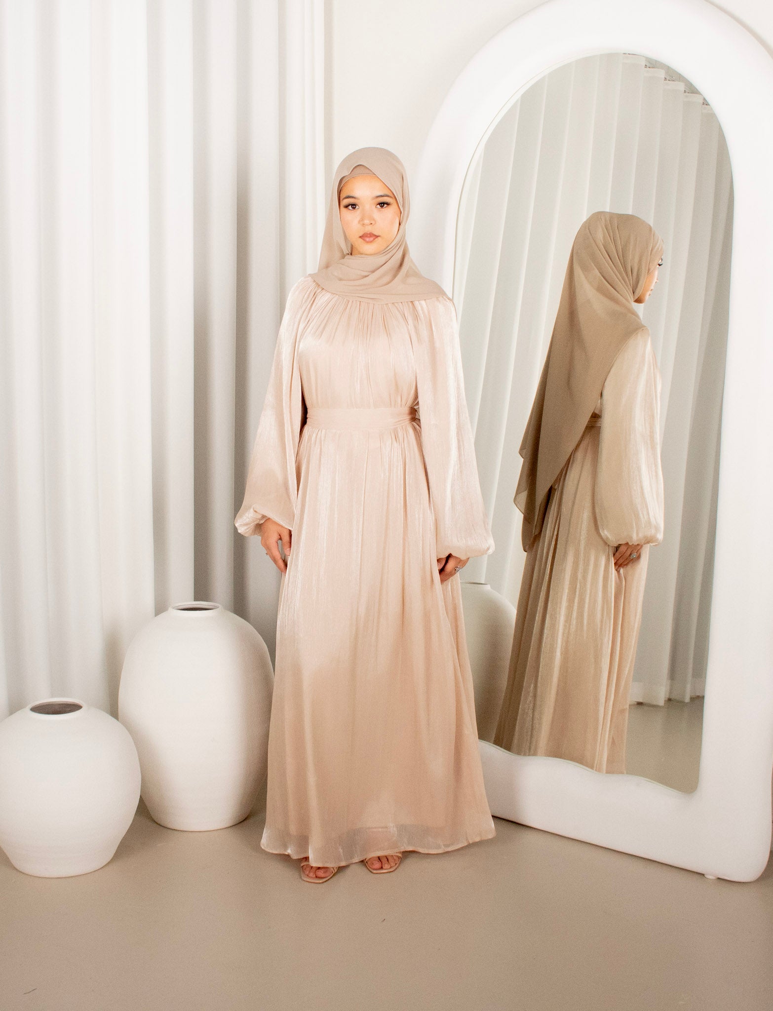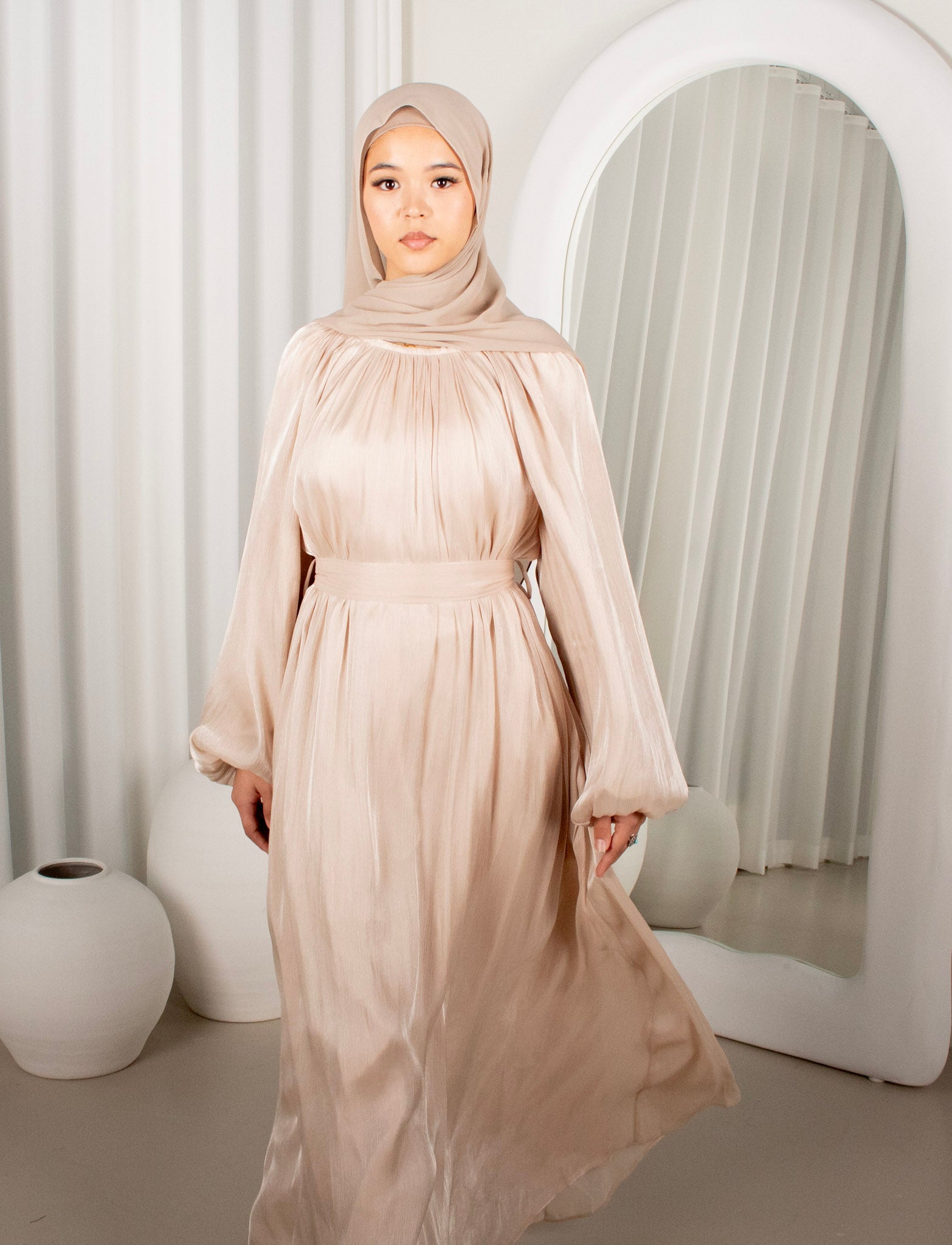 This elegant dress features a flowing, full-length silhouette crafted from a soft, crinkled satin-like fabric that drapes beautifully. The gown showcases long, billowy sleeves with gathered cuffs and a high, softly pleated neckline that adds a touch of sophistication. A matching fabric belt cinches the waist, enhancing the graceful, feminine shape. The subtle champagne-beige hue gives the dress a timeless and refined appeal, making it perfect for formal occasions, evening events, or special celebrations. Paired with a coordinating hijab, the look is effortlessly modest and luxurious.