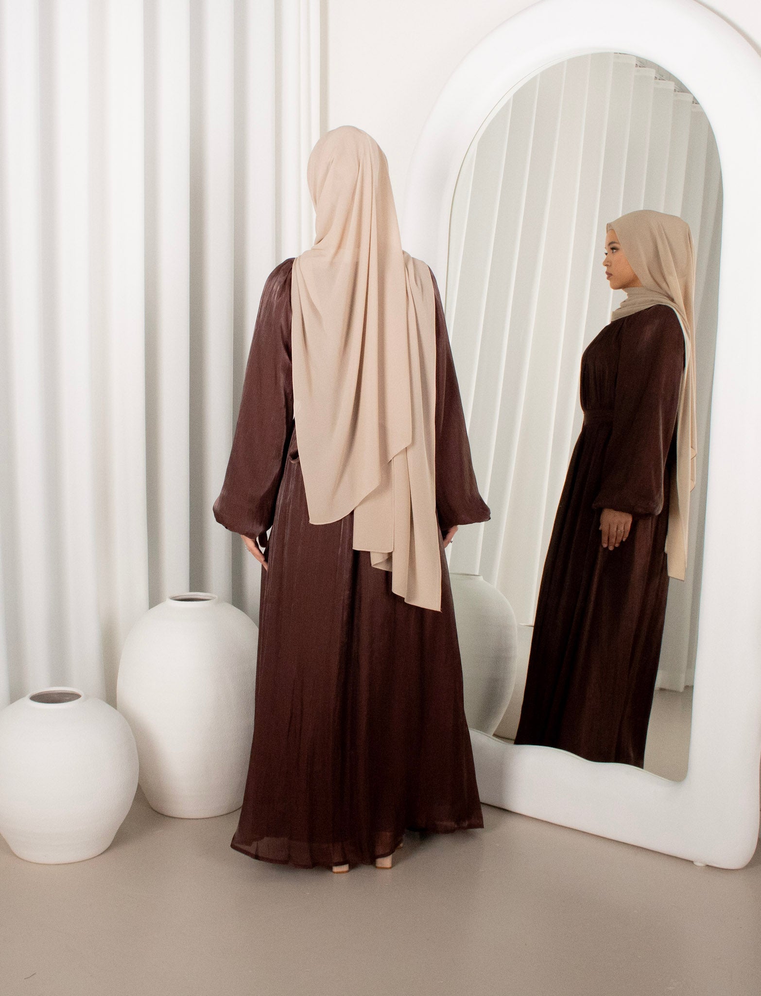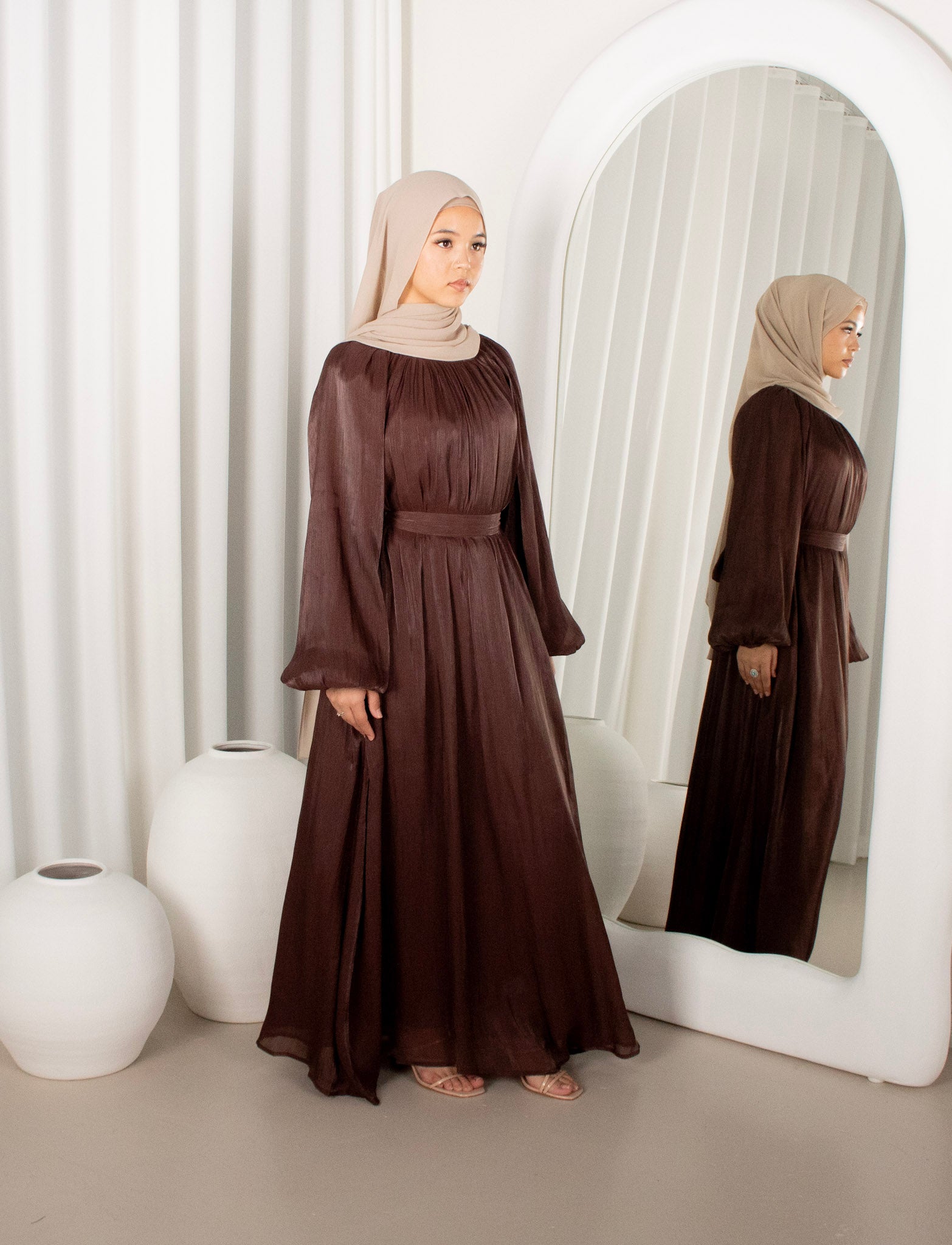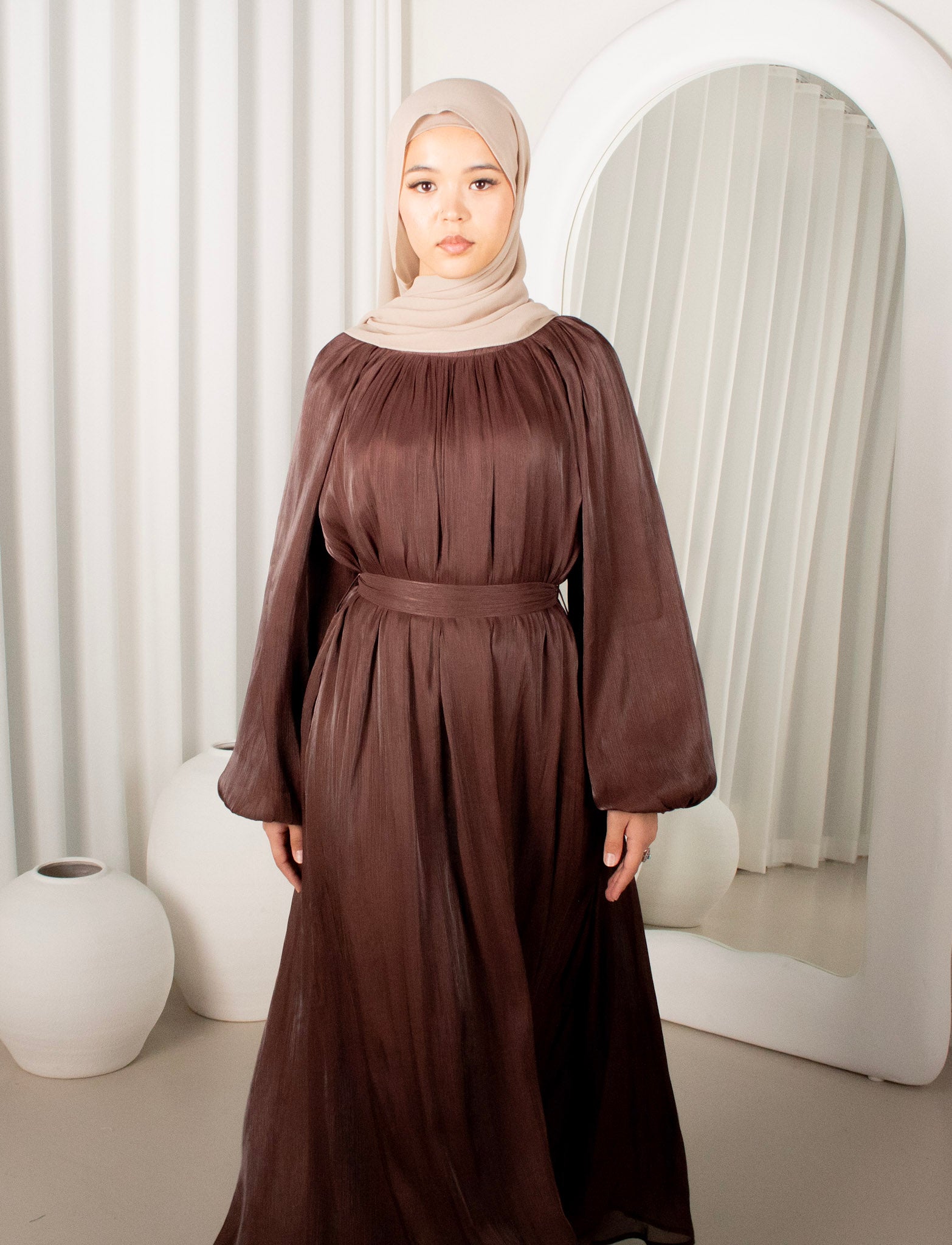 This elegant dress features a flowing, full-length silhouette crafted from a soft, crinkled silk-like fabric that drapes beautifully. The gown showcases long, billowy sleeves with gathered cuffs and a high, softly pleated neckline that adds a touch of sophistication. A matching fabric belt cinches the waist, enhancing the graceful, feminine shape. The subtle chocolate-brown hue gives the dress a timeless and refined appeal, making it perfect for formal occasions, evening events, or special celebrations. Paired with a coordinating hijab, the look is effortlessly modest and luxurious.