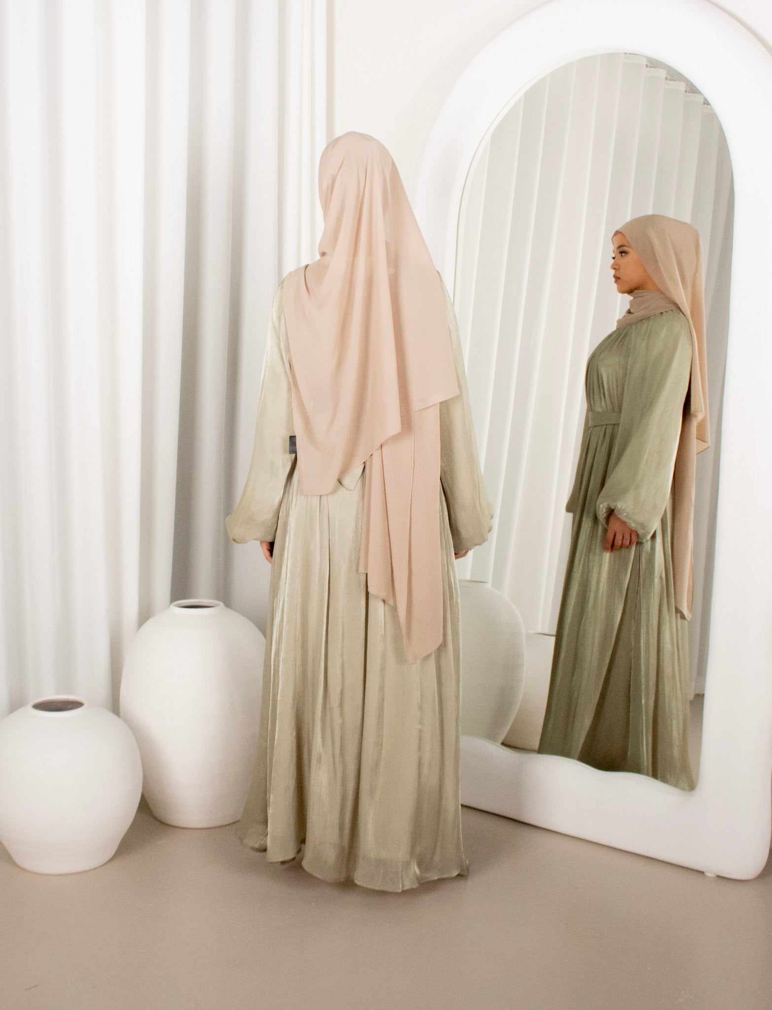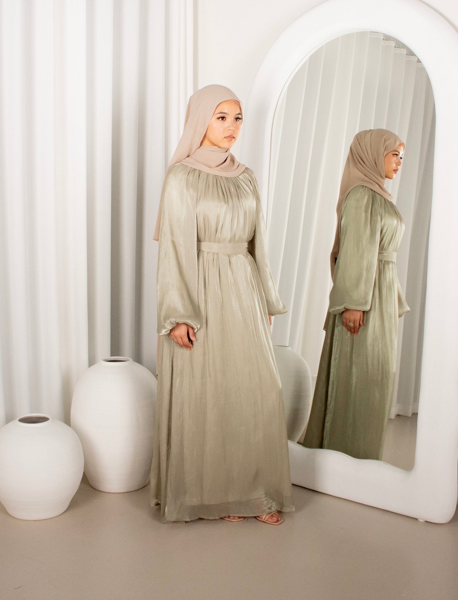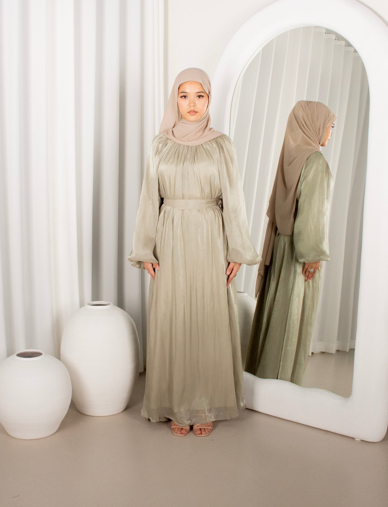 This elegant dress features a flowing, full-length silhouette crafted from a soft, crinkled silk-like fabric that drapes beautifully. The gown showcases long, billowy sleeves with gathered cuffs and a high, softly pleated neckline that adds a touch of sophistication. A matching fabric belt cinches the waist, enhancing the graceful, feminine shape. The subtle sage hue gives the dress a timeless and refined appeal, making it perfect for formal occasions, evening events, or special celebrations. Paired with a coordinating hijab, the look is effortlessly modest and luxurious.