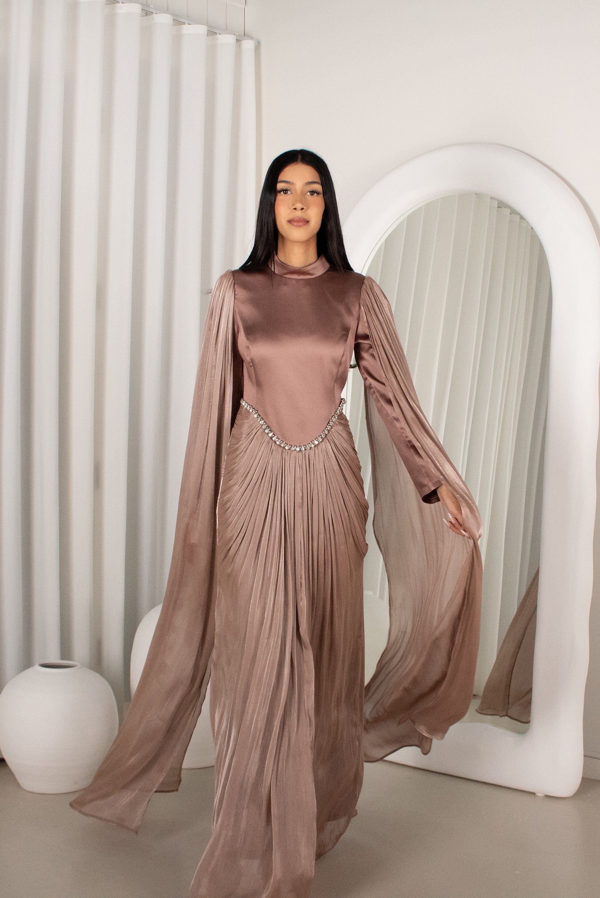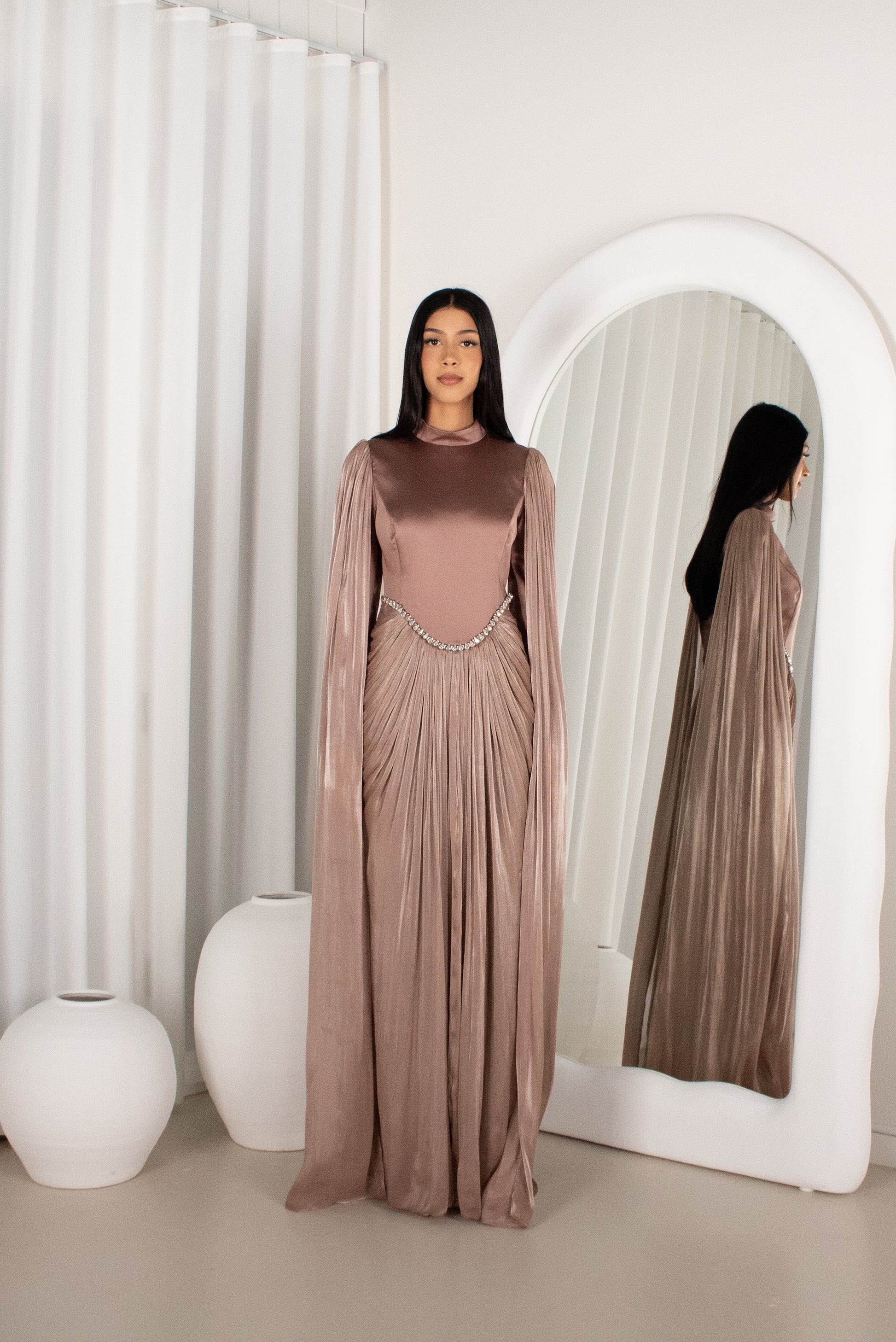This elegant dress is made from a soft, lightweight fabric that flows beautifully. It features sheer cape-style sleeves that drape effortlessly from the shoulders, adding a graceful touch. Delicate beading at the waist adds subtle sparkle, while the gathered skirt creates gentle movement. A timeless choice for formal events and special occasions.