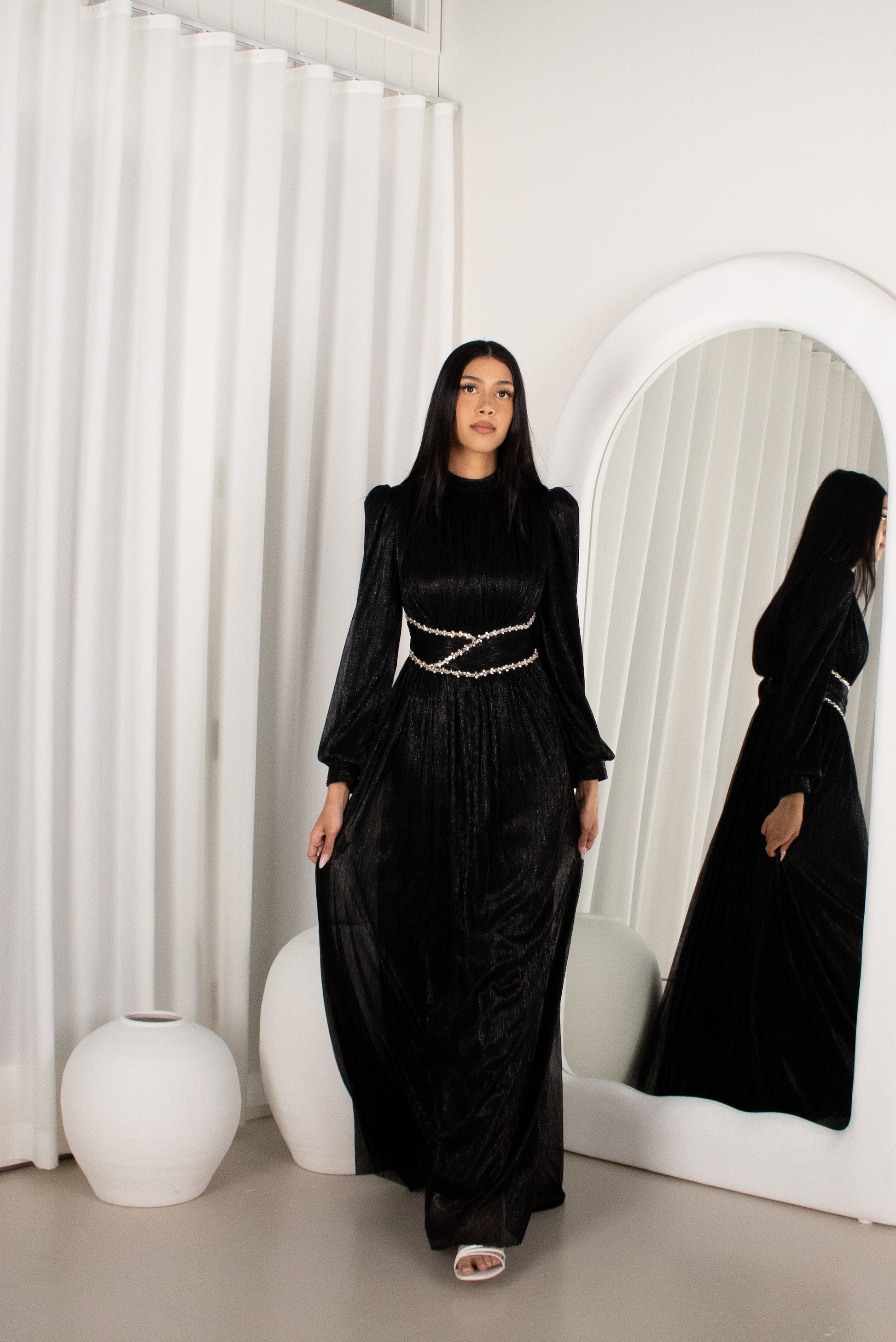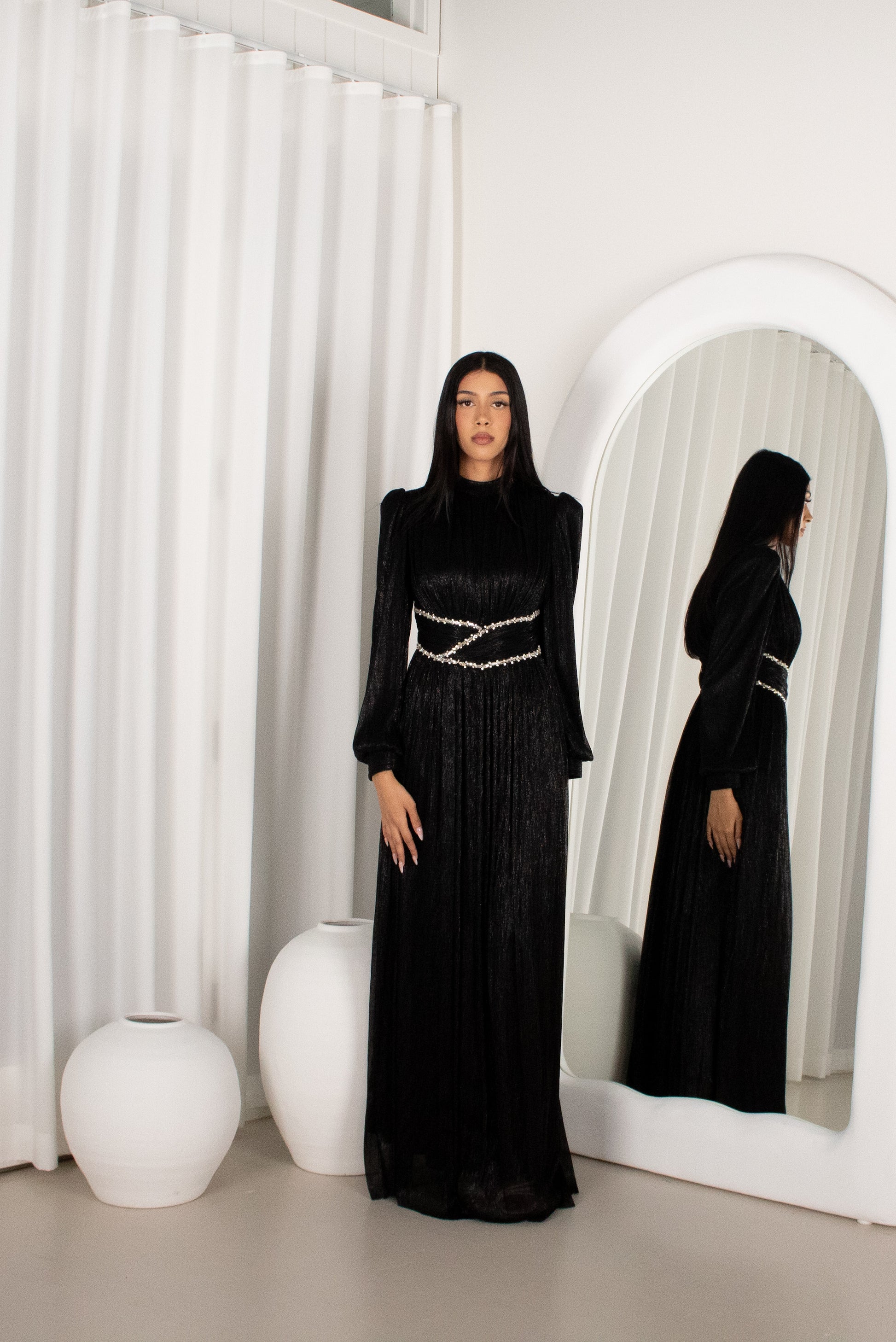 Crafted in Turkiye from a soft cotton-blend fabric, this timeless pleated dress combines comfort with refined elegance. Featuring delicate vertical pleats that flow effortlessly, it is designed with a high neckline and long, softly gathered sleeves for a graceful silhouette. The waist is beautifully accented with subtle beaded detailing, adding a touch of understated glamour while enhancing the shape. Lightweight, breathable, and fully lined, this dress is perfect for special occasions, evening events, or elevated modest wear.