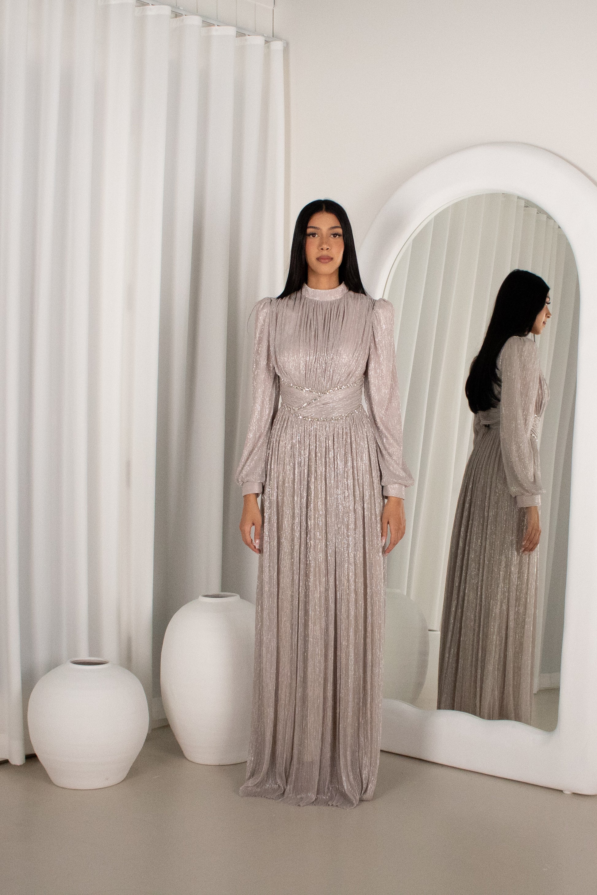 Crafted in Turkiye from a soft cotton-blend fabric, this timeless pleated dress combines comfort with refined elegance. Featuring delicate vertical pleats that flow effortlessly, it is designed with a high neckline and long, softly gathered sleeves for a graceful silhouette. The waist is beautifully accented with subtle beaded detailing, adding a touch of understated glamour while enhancing the shape. Lightweight, breathable, and fully lined, this dress is perfect for special occasions, evening events, or elevated modest wear.