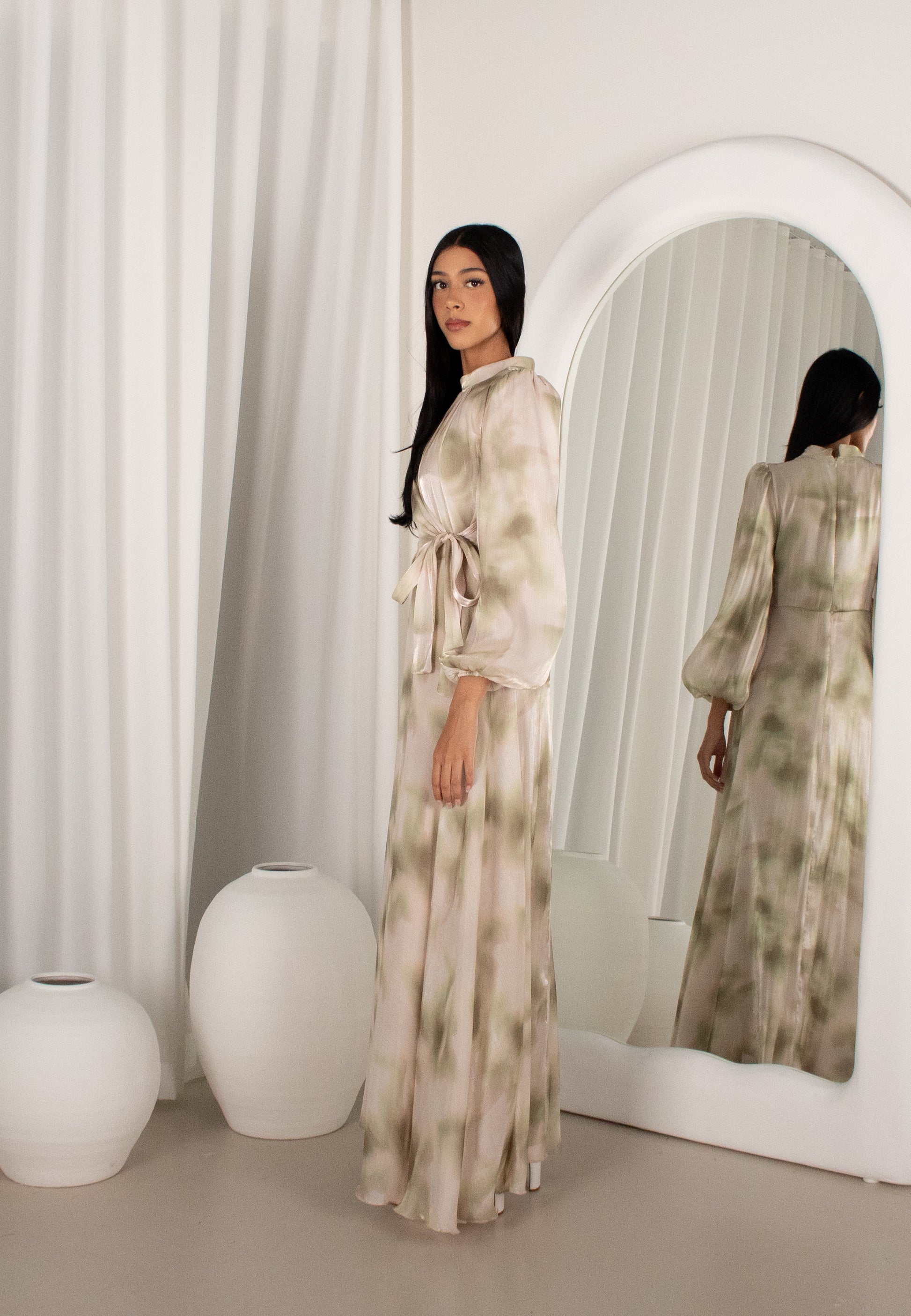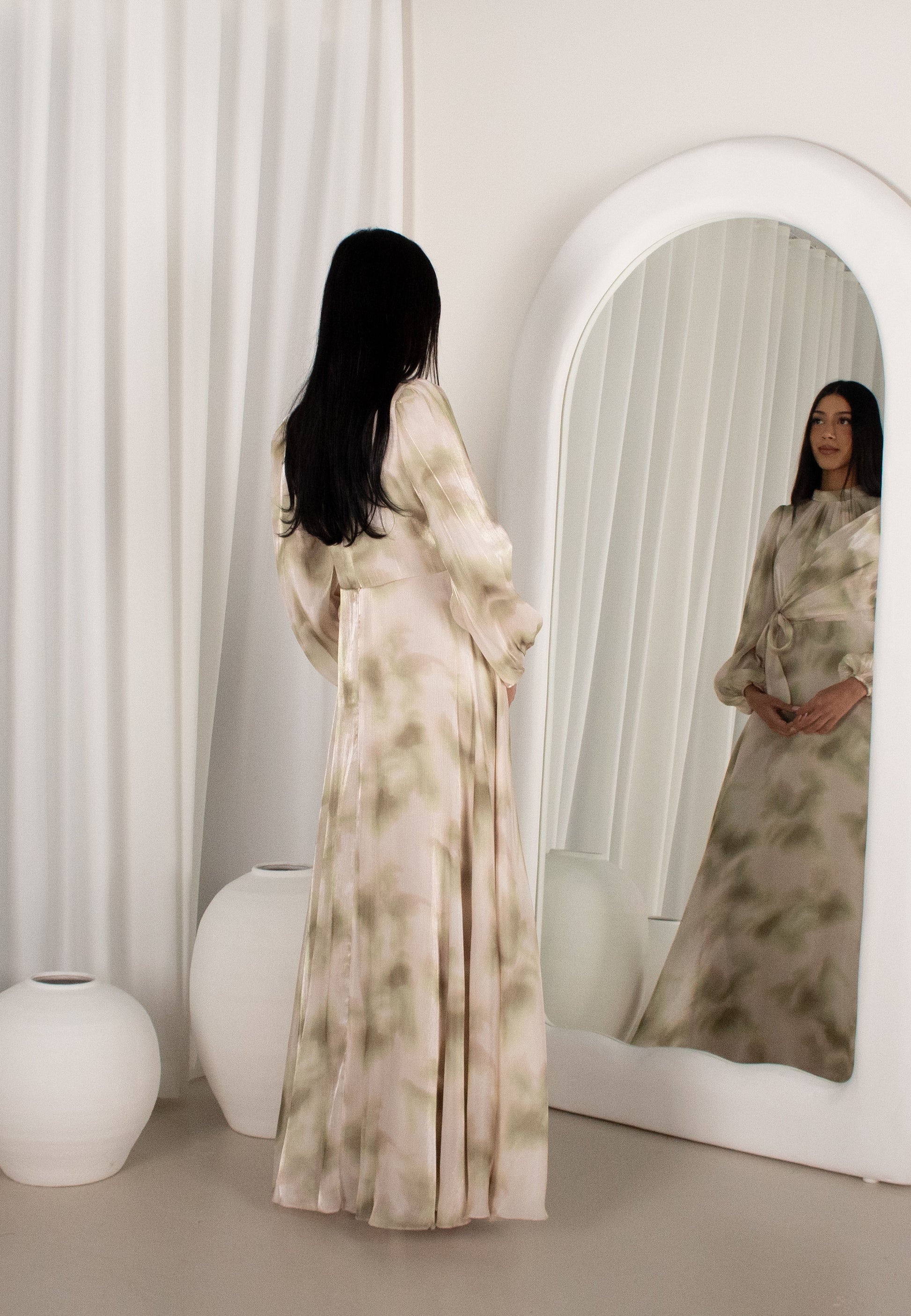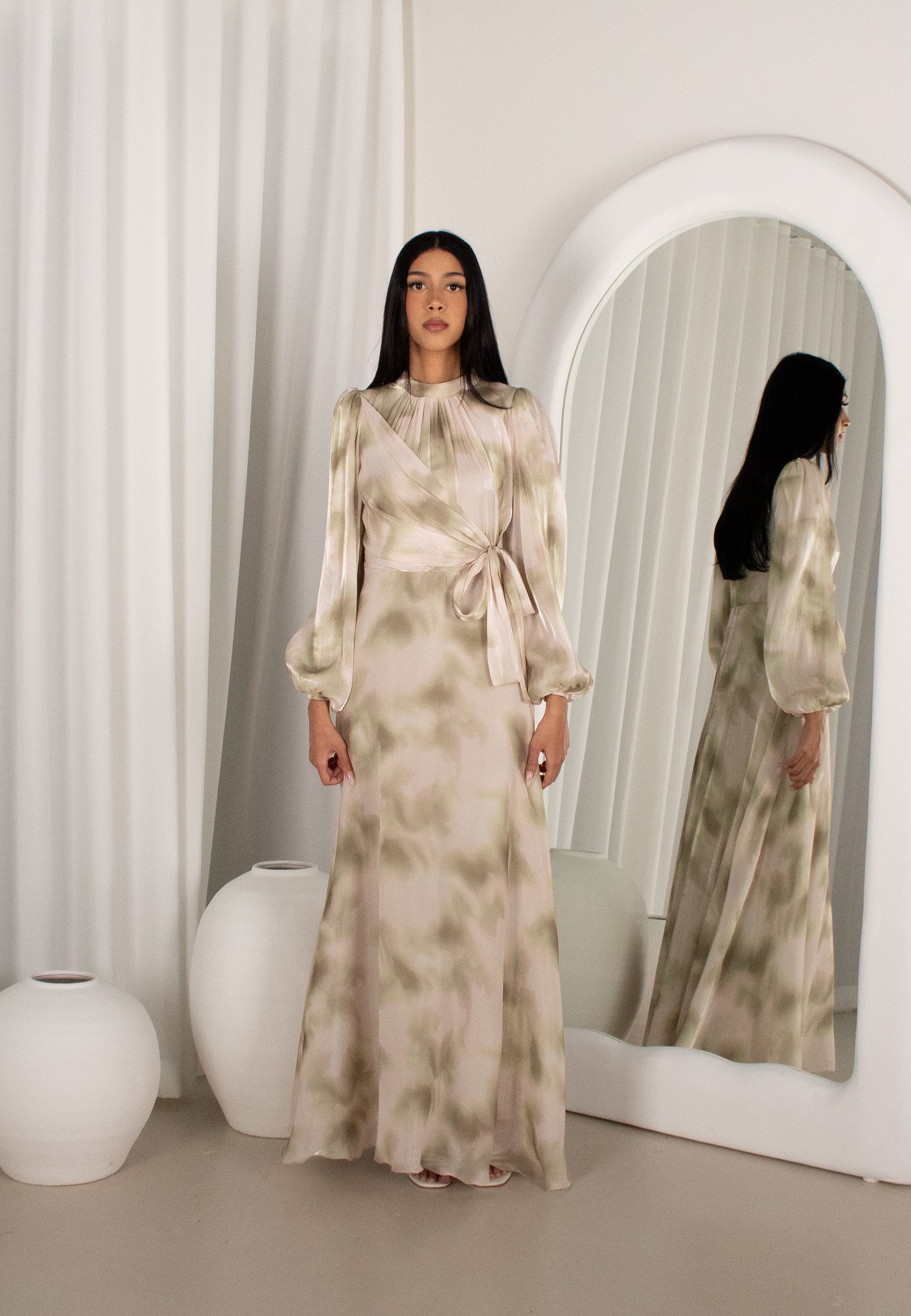 This romantic full-length dress is crafted from a lightweight, airy fabric featuring a soft floral print in warm neutral tones. Designed with an elegant draped bodice and gentle gathering at the waist, it creates a flowing, feminine shape with beautiful movement. The long sleeves are finished with delicate bow tie details at the cuffs, adding a graceful and refined touch. Finished with a softly structured neckline and fluid skirt, this dress is perfect for special occasions, daytime events, or elevated evening wear.