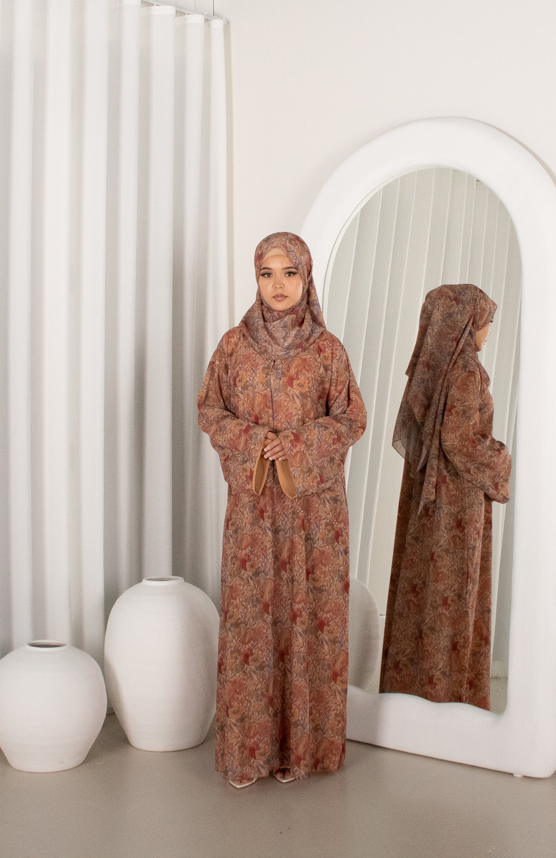 A soft, flowy chiffon abaya featuring a warm floral print and a flattering A-line cut that gently widens from the shoulders for a modest, elegant drape. Designed with loose sleeves for comfort and ease of movement. Comes with a matching scarf for a complete, coordinated look. Made in Dubai and perfect for both everyday wear and special occasions.