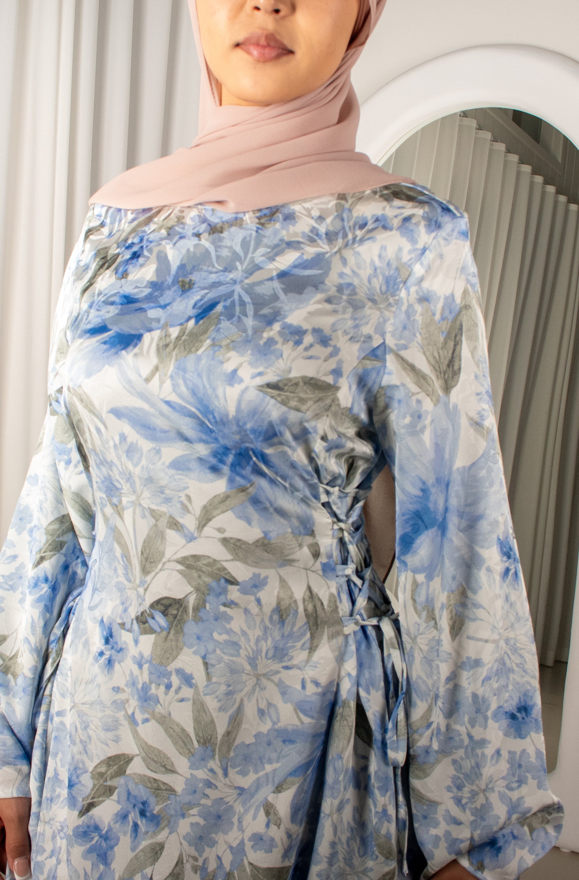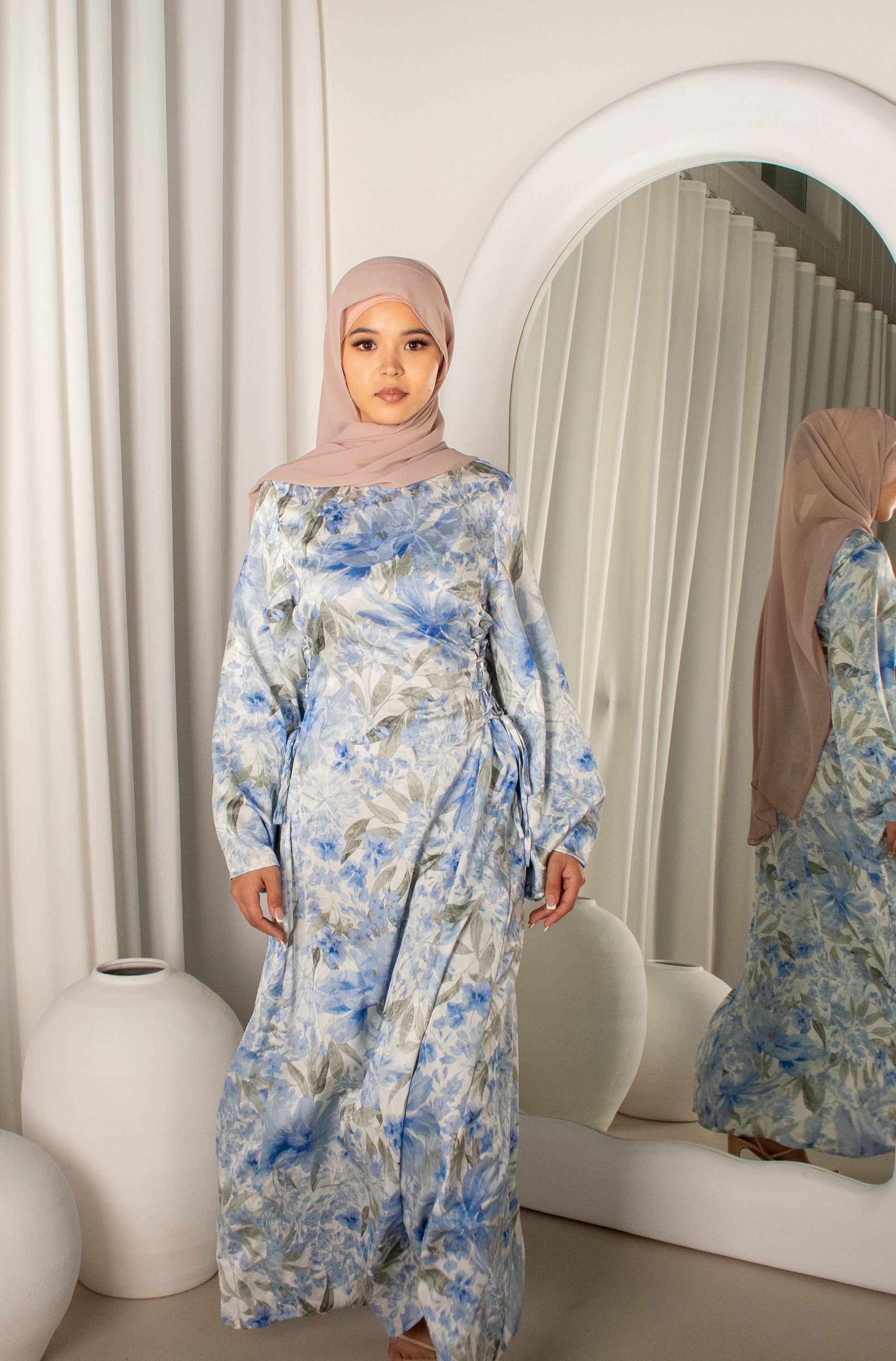 This dress features a delicate and sophisticated floral print in soft shades of blue, the design flows elegantly from top to bottom, the relaxed silhouette offers both comfort and grace. The light airy fabric is perfect for the summer and spring, very versitile for both casual and sei formal occasions.
