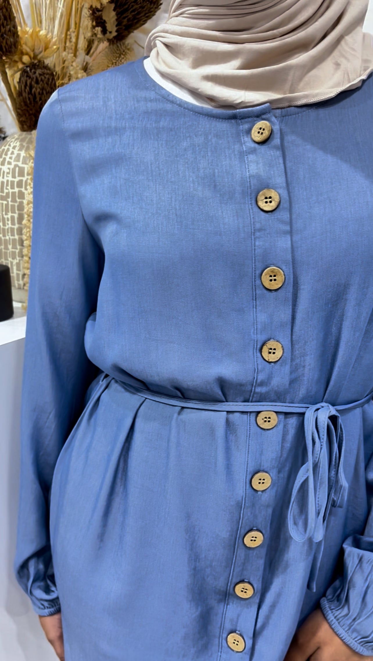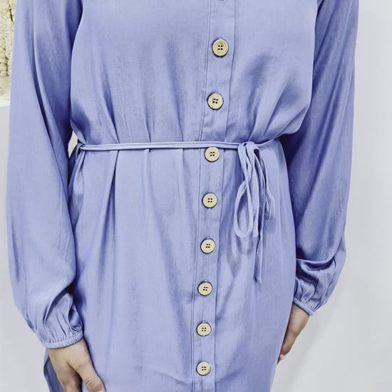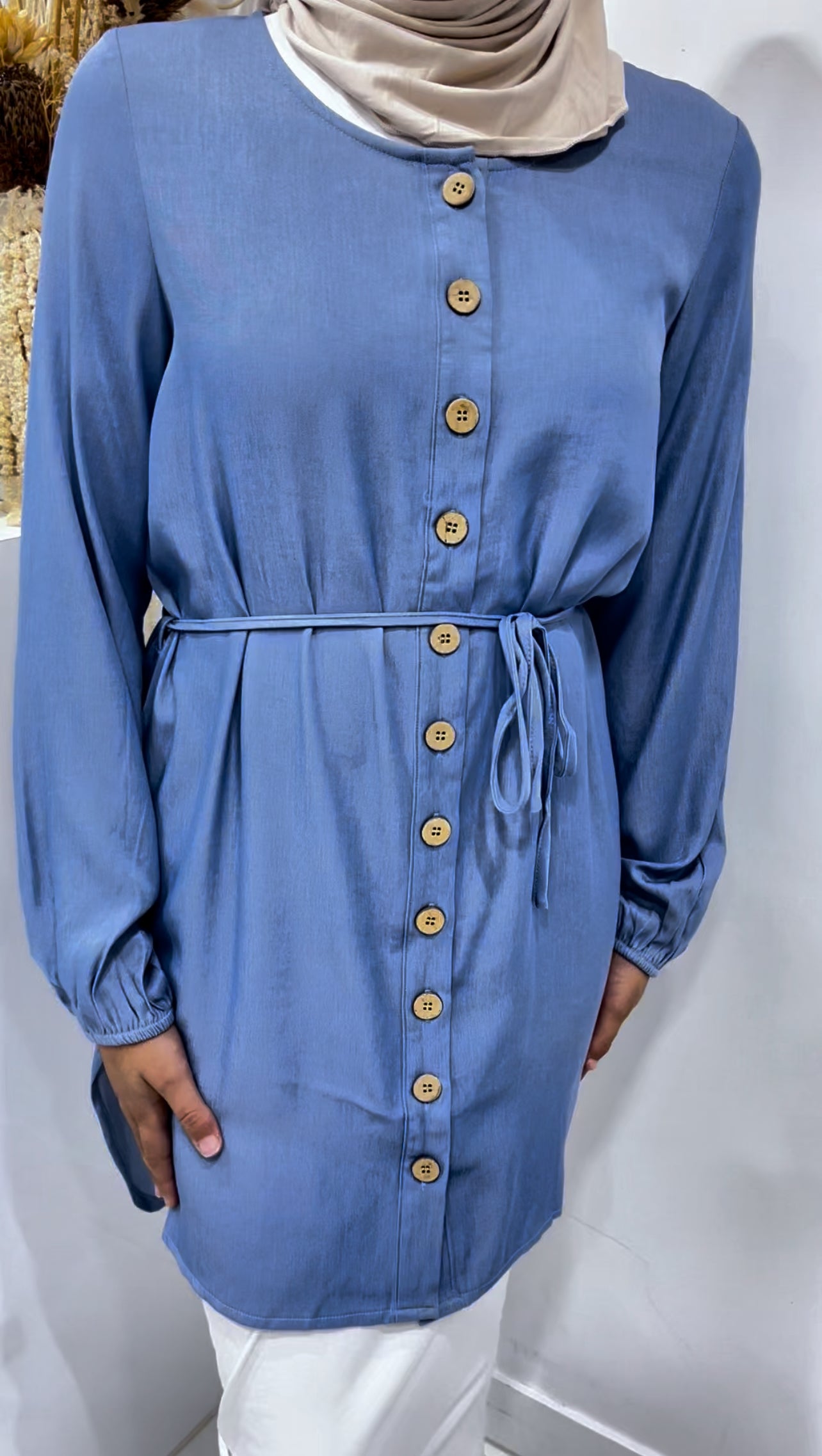 The Georgia denim top with round neckline and regular sleeve style, perfect for the any season. This cotton long top features convenient tied up waistline belt, cuffed sleeves and buttons down the front.
