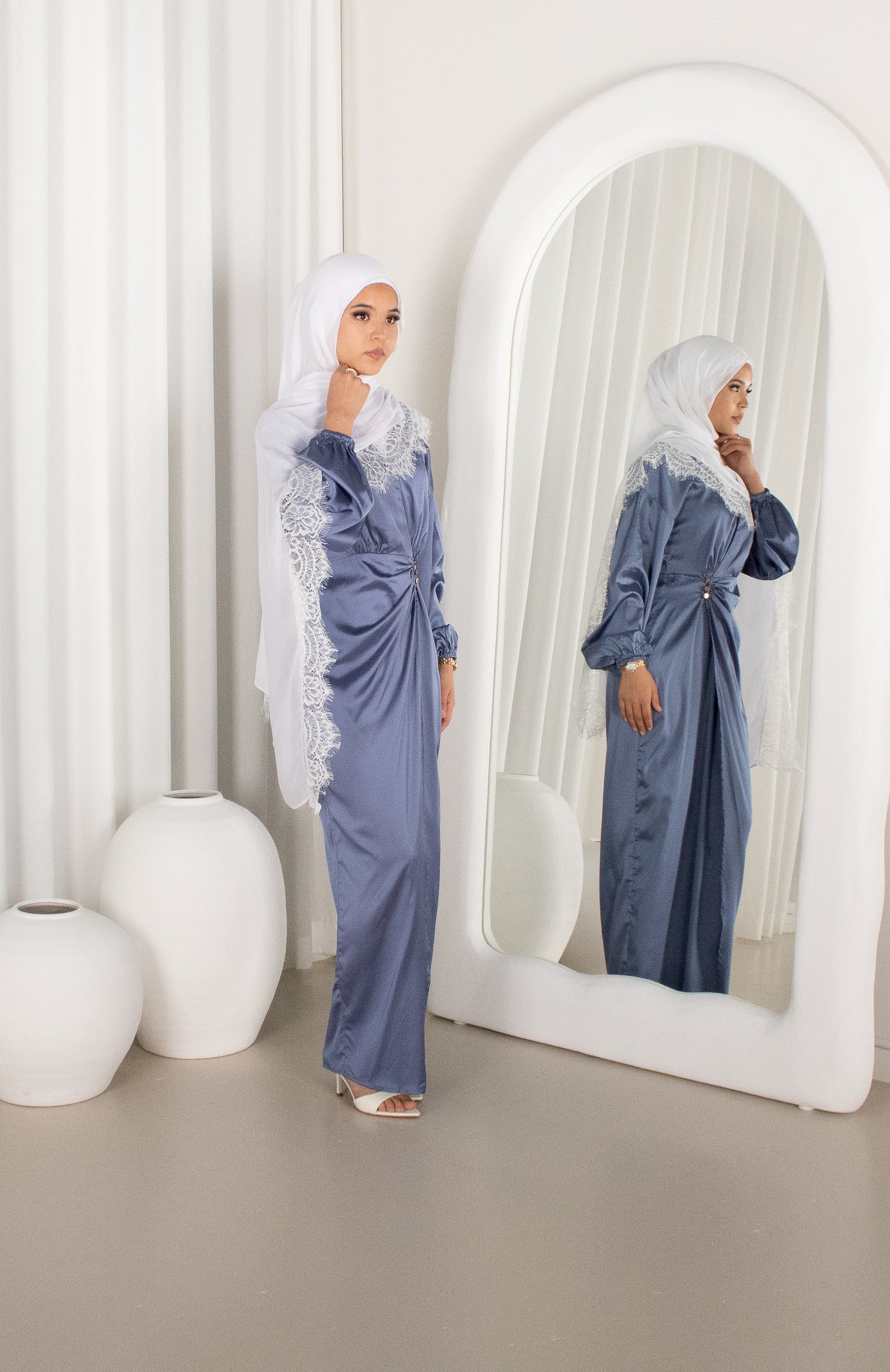 This dress is a soft, elegant piece with a luxurious, feminine feel. It’s made from a satin-like fabric in a muted blue tone, giving it a smooth, slightly glossy finish.